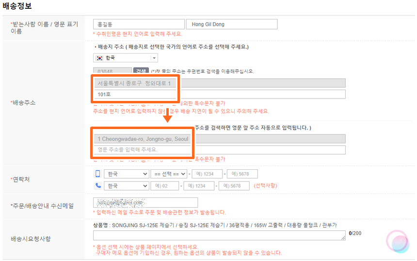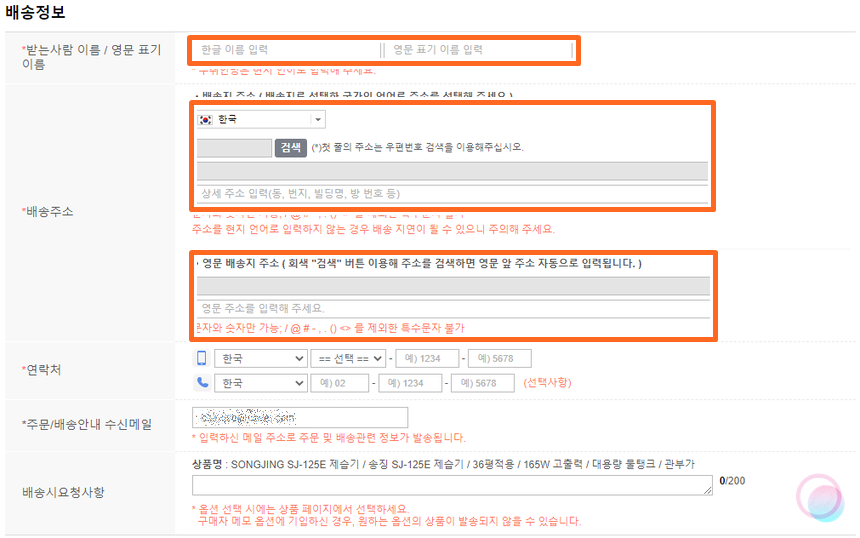 배송에 관련 연락을 받을 전화번호와 이메일을 입력해주세요. 입력이 끝난 후 기본적으로 배송시 요청할 사항을 입력해주시면 되요. 한글로 입력하셔도 됩니다.