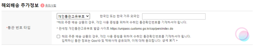 아래로 조금 더 내려가보면 해외배송 추가정보가 나오는데요. 여기에는 개인통관보유부호와 여권번호를 입력해주어야 합니다. 여권을 가지고 계신 분들은 여권 번호를 입력해주시면 되지만, 없으신 분들은 개인통관고유부호를 발급받아야 하는데요. 발급 방법은 아래의 더보기를 참고해보세요.