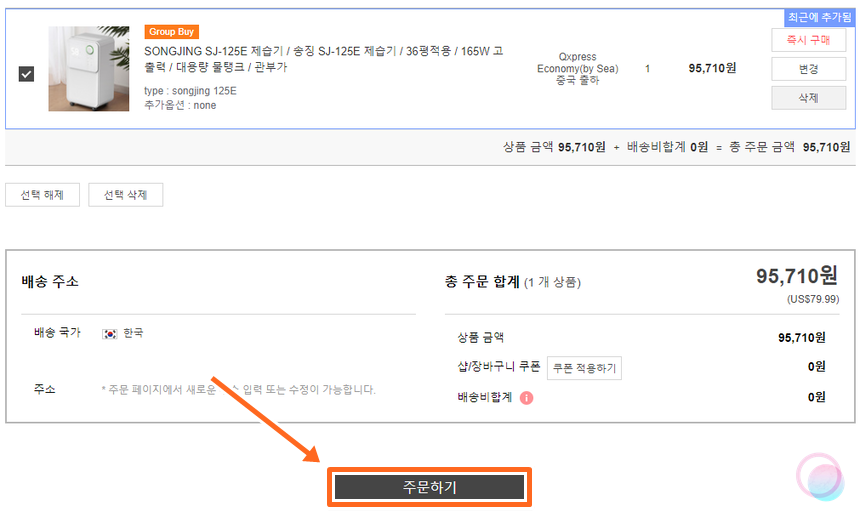 제일 먼저 큐텐에 회원가입을 진행해주세요. 한글로 되어있어서 어려운 부분은 없으실 거예요. 회원가입을 끝냈다면 직구하고자 하는 상품을 장바구니에 담고 장바구니로 이동한 후 주문하기를 눌러주세요. 저는 샤오미의 송징 제습기를 구매해보도록 할게요.