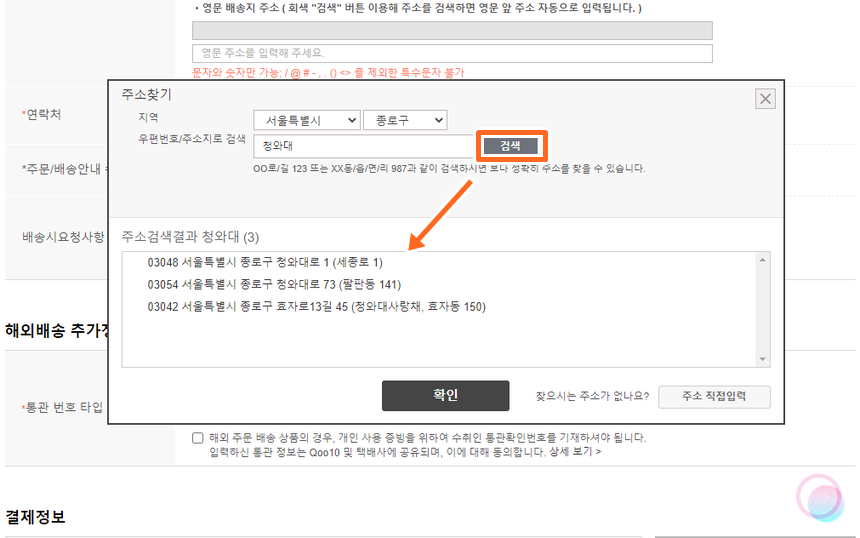 주소 입력은 시와 구를 선택하고 검색을 누르면 하단에 주소지가 나와요. 여기까지는 국내 쇼핑몰에서 주문하는 것과 크게 다를게 없어요.