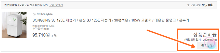 이제 주문 내역을 확인해보시면 주문한 상품이 언제 배달되는지 예상 일자를 확인할 수 있고 취소신청을 누르면 주문을 취소할 수도 있어요.