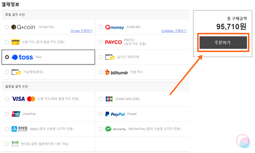 이제 결제 과정만 넘어가면 끝이랍니다. 요즘 간편 결제 수단으로 토스를 이용하고 있는데 큐텐에서도 토스 결제를 지원하고 있네요! 그래서 저는 토스를 선택했어요.