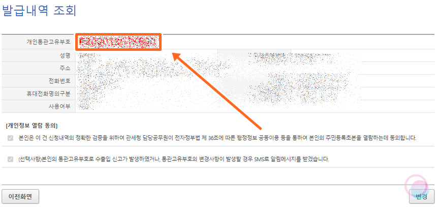 그러면 최상단에 빨간색 글씨가 나오는데, 이게 바로 개인통관고유부호랍니다. 나중에 국세청을 통해 다시 조회할 수 있지만 귀찮기 때문에 스마트폰이나 메모장에 따로 저장을 해두시는걸 추천드려요.