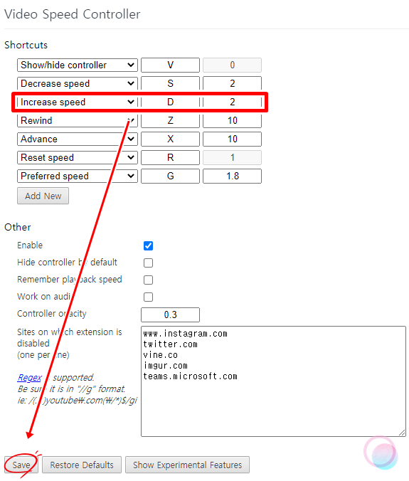 설정 메뉴의 Increase speed가 속도 증가 부분이니 원하는 값으로 설정을 해주고 하단에 있는 Save를 눌러서 설정값을 저장해주세요. 가끔 설정이 저장되지 않는 버그가 있는데.. 그때는 그냥 크롬을 재시작 하시면 해결되기도 해요.