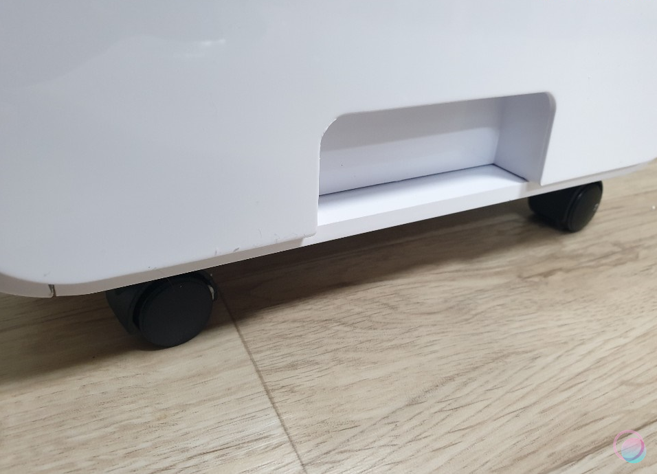 뒷면에는 손잡이가 달려있어서 위치를 요리조리 옮길 수 있어요. 무게는 보기보다 엄청 무거워서 손잡이로 옮기긴 살짝 힘들지만 하단에 바퀴가 달려있어서 쉽게 옮길 수 있어요.