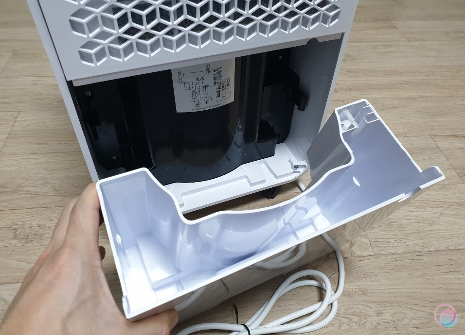2L의 물이 저장되는 물통입니다. 이곳에 제습기가 빨아들인 물을 저장되는데요. 가득 찰 경우에는 자동으로 제습기가 작동을 멈추기 때문에 물이 넘칠까봐 걱정하지 않으셔도 된답니다.
