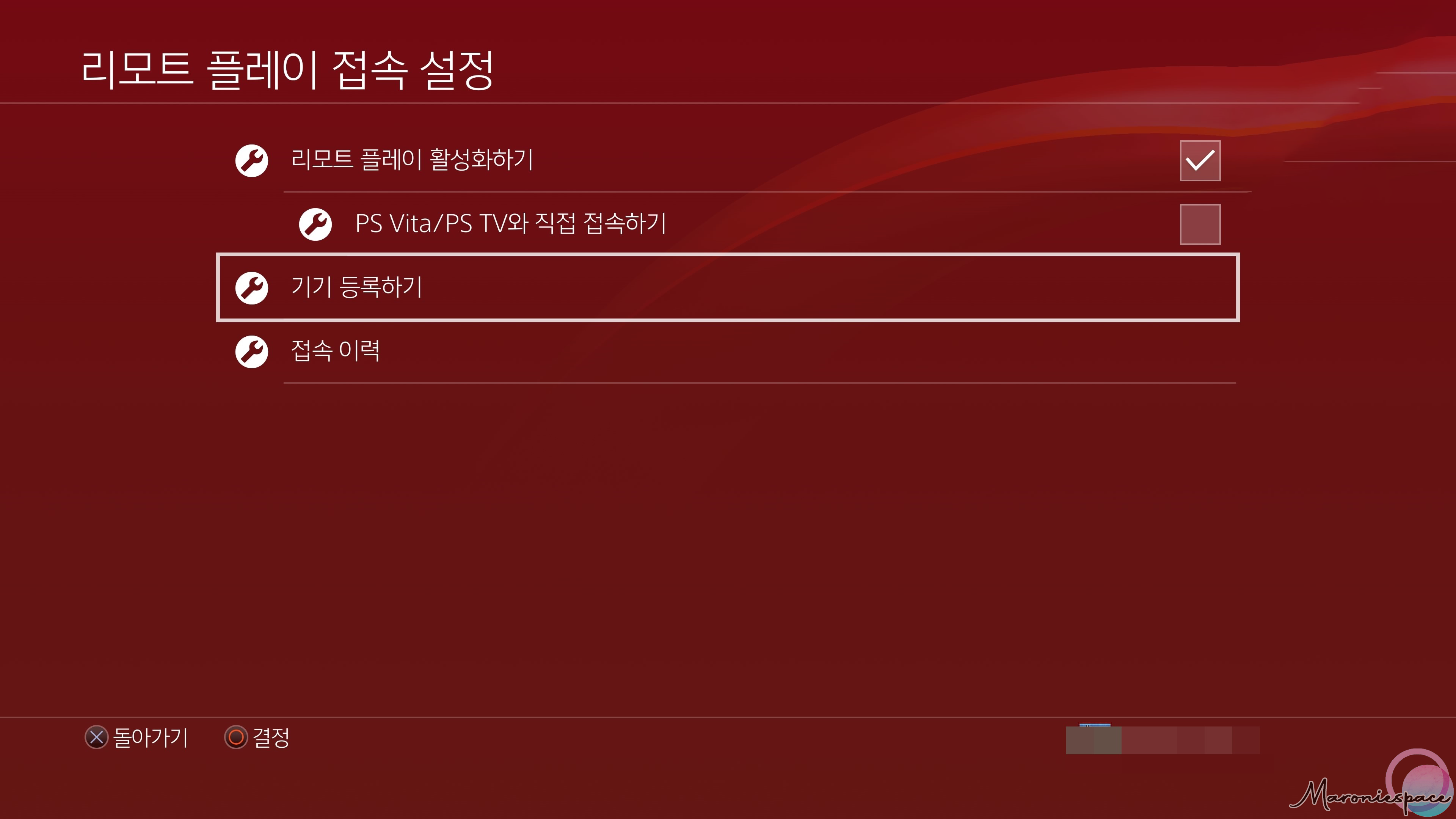 마지막으로 PS4의 리모트 플레이 기능을 활성화 해주기만 하면 됩니다. 설정-리모트 플레이 접속 설정-리모트 플레이 활성화 하기를 체크한 후 기기 등록하기를 눌러서 8자리의 코드를 확인합니다.