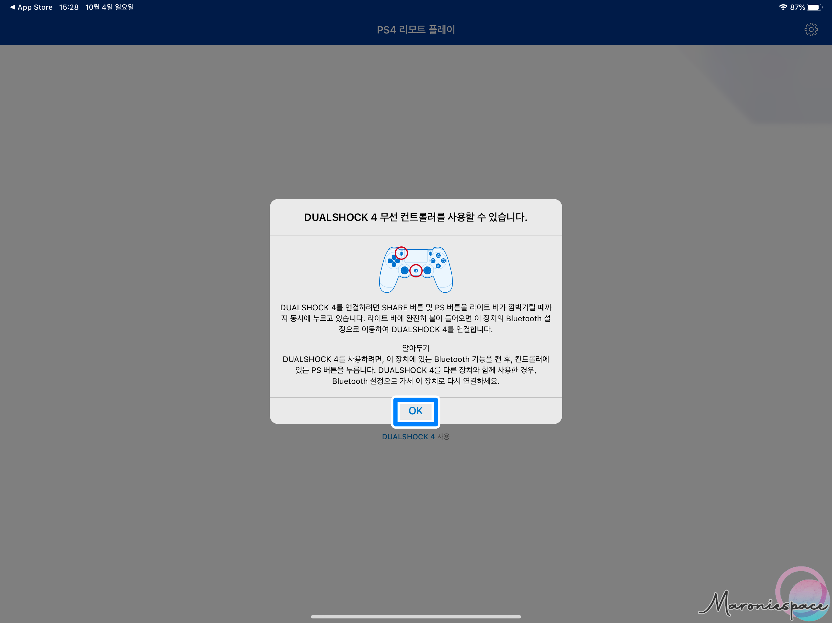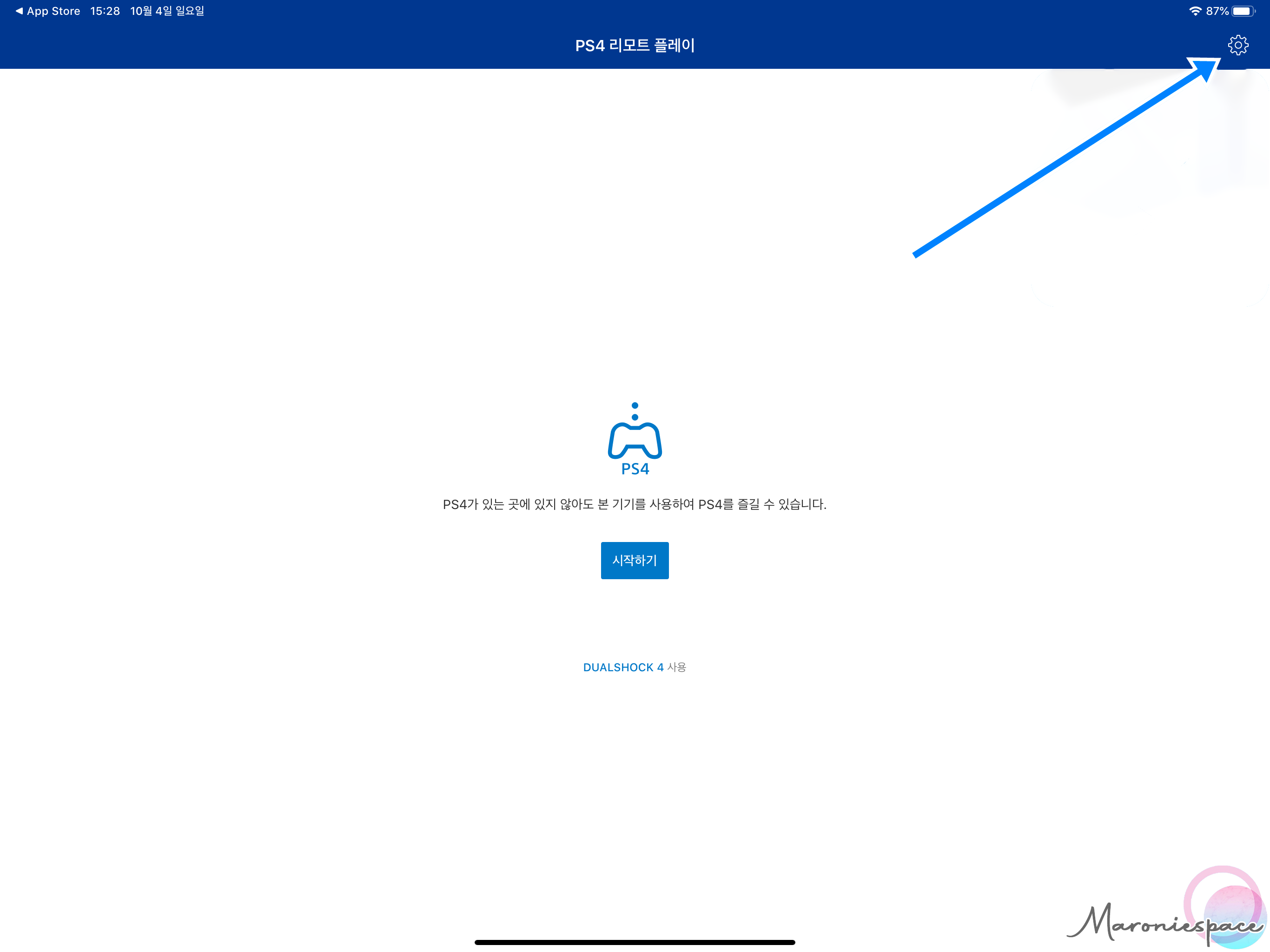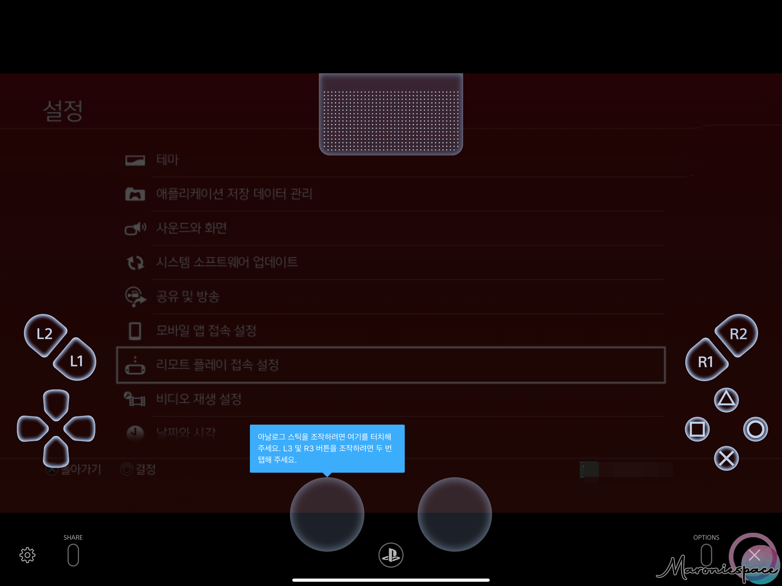 그러면 아이패드 프로 화면에 PS4 화면이 출력됩니다. 화면에 터치하여 조작하는 방법도 있지만 듀얼쇼크4로 조작하는게 더 편하기 때문에 저는 아이패드에 듀얼쇼크를 연결하기로 했습니다.