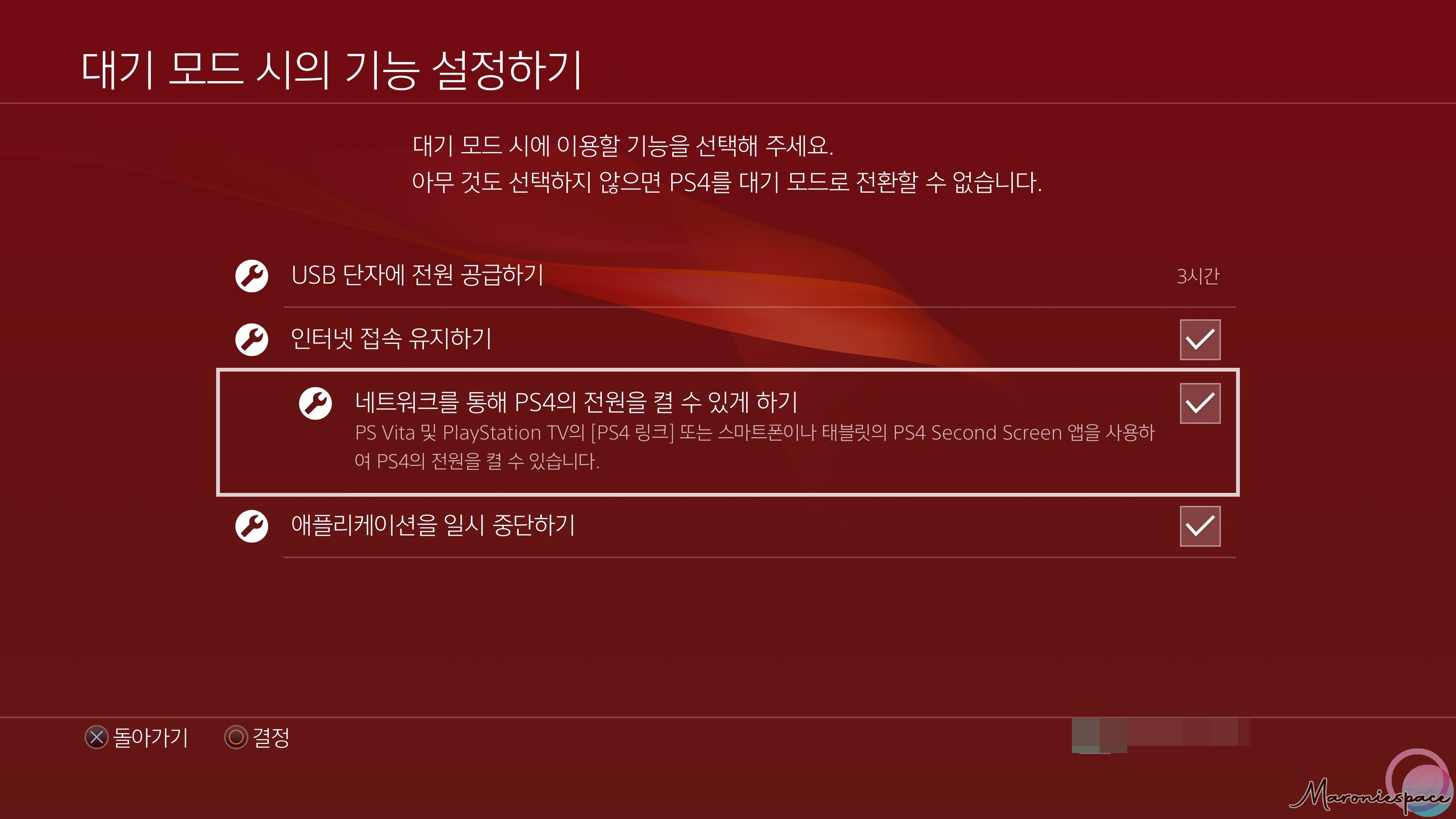 그 다음에는 PS4가 대기중에도 언제든 외부에서 실행할 수 있도록 설정을 해주어야 하는데요. 이 설정은 설정-절전모드 설정-대기 모드 시의 기능 설정하기-네트워크를 통해 PS4의 전원을 켤 수 있게 하기를 켜주기만 하면 됩니다.