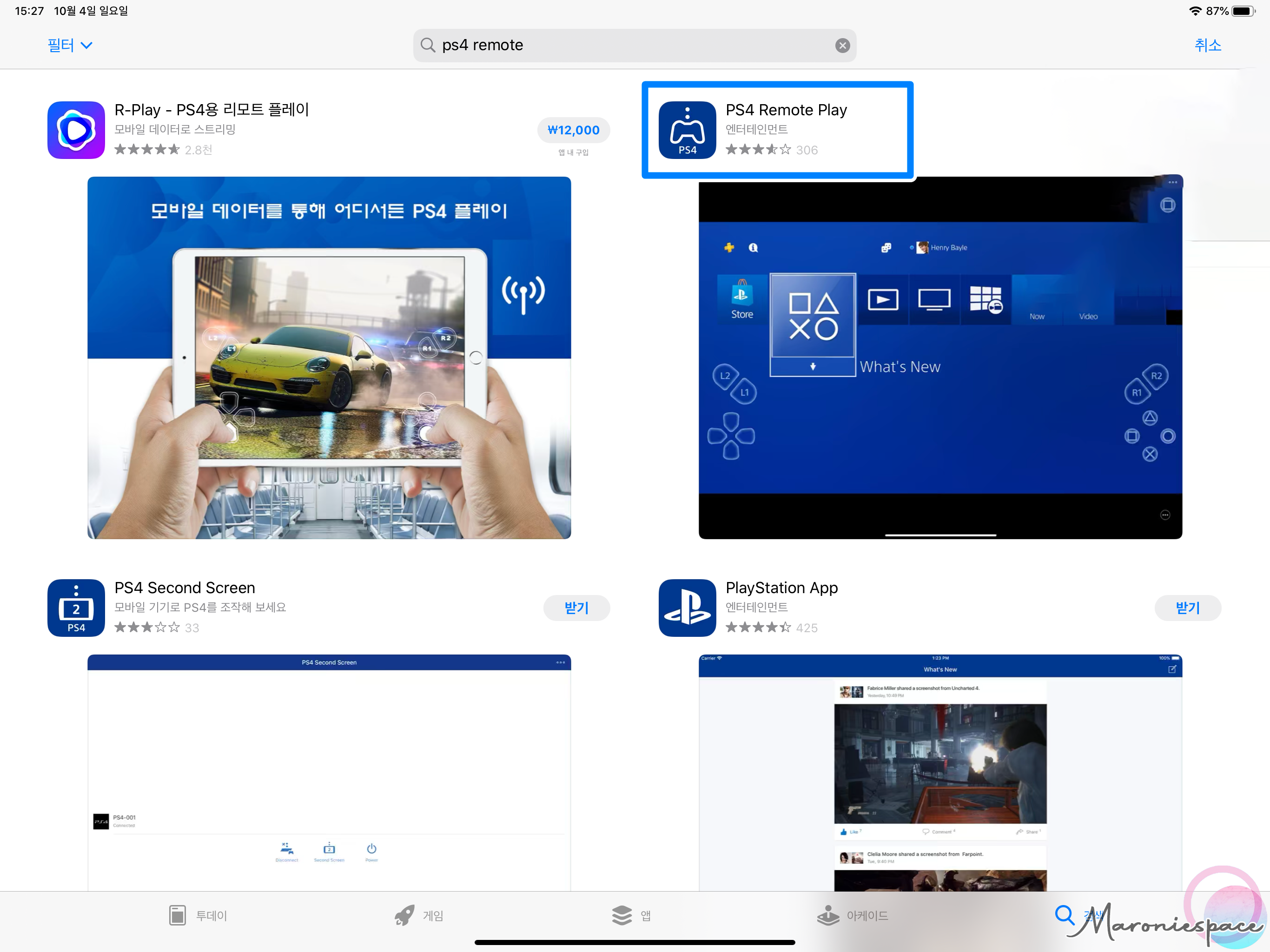 PS4의 설정이 모두 끝났으니 이제 아이패드 프로에서 앱을 설치하면 됩니다. 앱스토어에서 PS4 MEMOTE를 검색한 후 사진에 나와있는 아이콘 모양 앱을 설치해주세요.