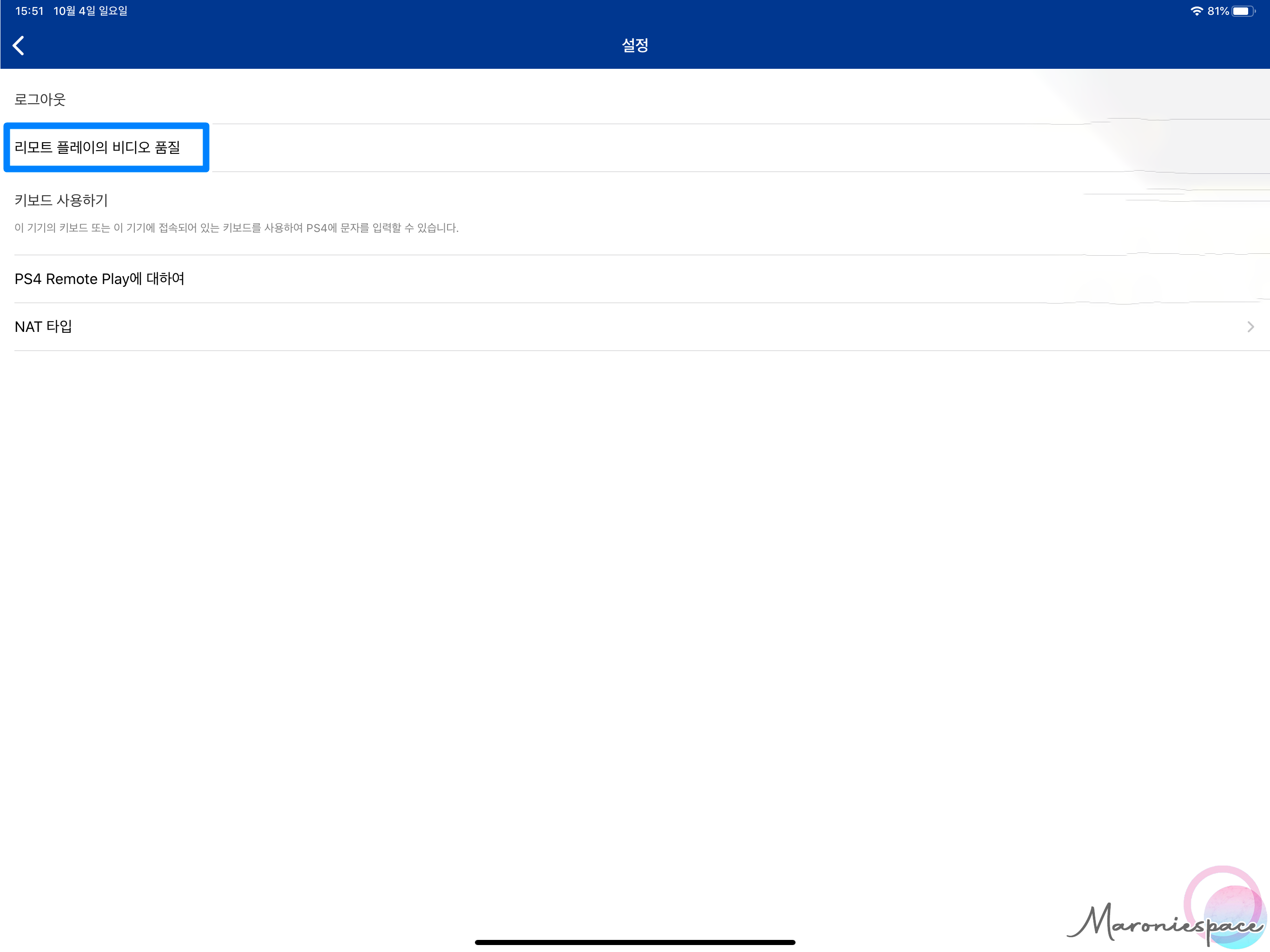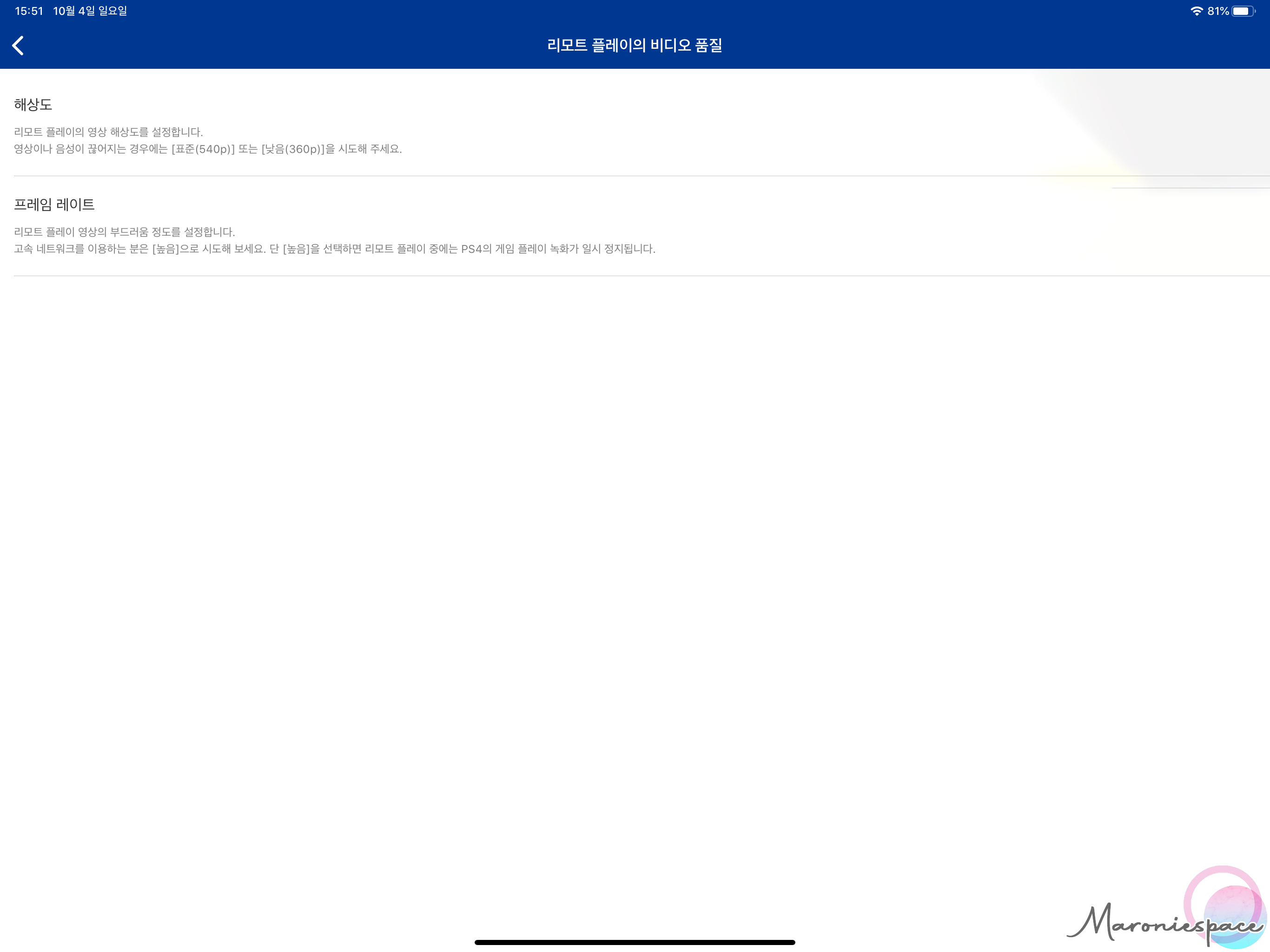 아무런 설정을 하지 않으면 해상도가 매우 구리고 프레임이 매우 낮으니 조작감이 개똥일 수 있어요. 그러면 리모트 플레이 메인 화면에서 설정으로 들어간 후 리모트 플레이의 비디오 품질로 들어가서 해상도와 프레임 레이트를 올려주시면 됩니다.
