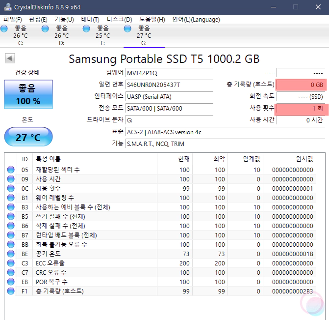 여기서 우리가 확인해야할 부분은 총 기록량과 사용 횟수겠죠? 총 기록량은 해당 SSD에 얼마나 많은 정보가 오고갔는지를 표기해주는 것이며 사용 횟수는 해당 SSD가 얼마나 로드되었는지를 보여주는 횟수입니다. 새제품일 경우에는 확인을 위해 최초 연결을 진행한 것이니 1회로 표기되는게 정상이랍니다.