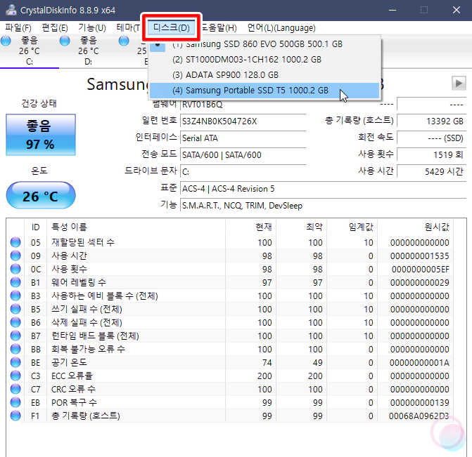 사용 시간 확인을 원하는 SSD를 PC에 연결하고 설치된 CrystalDiskInfo를 실행한 다음 상단의 디스크-연결한 SSD를 선택하면 해당 디스크에 대한 정보가 나타납니다.
