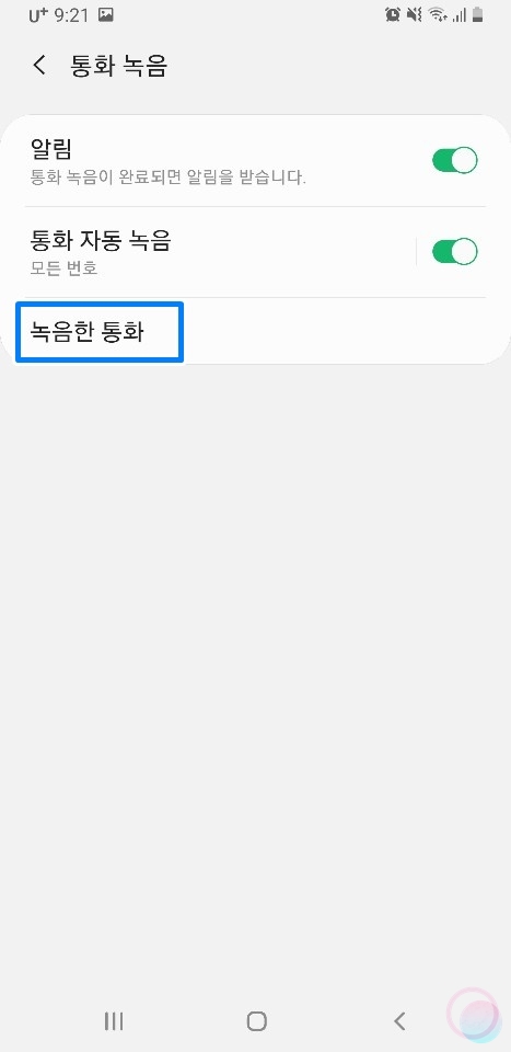 녹음된 파일은 아까 설정으로 진입했던것 처럼 전화-점 3개-설정-통화 녹음영역에서 녹음한 통화를 눌러서 확인할 수 있거나