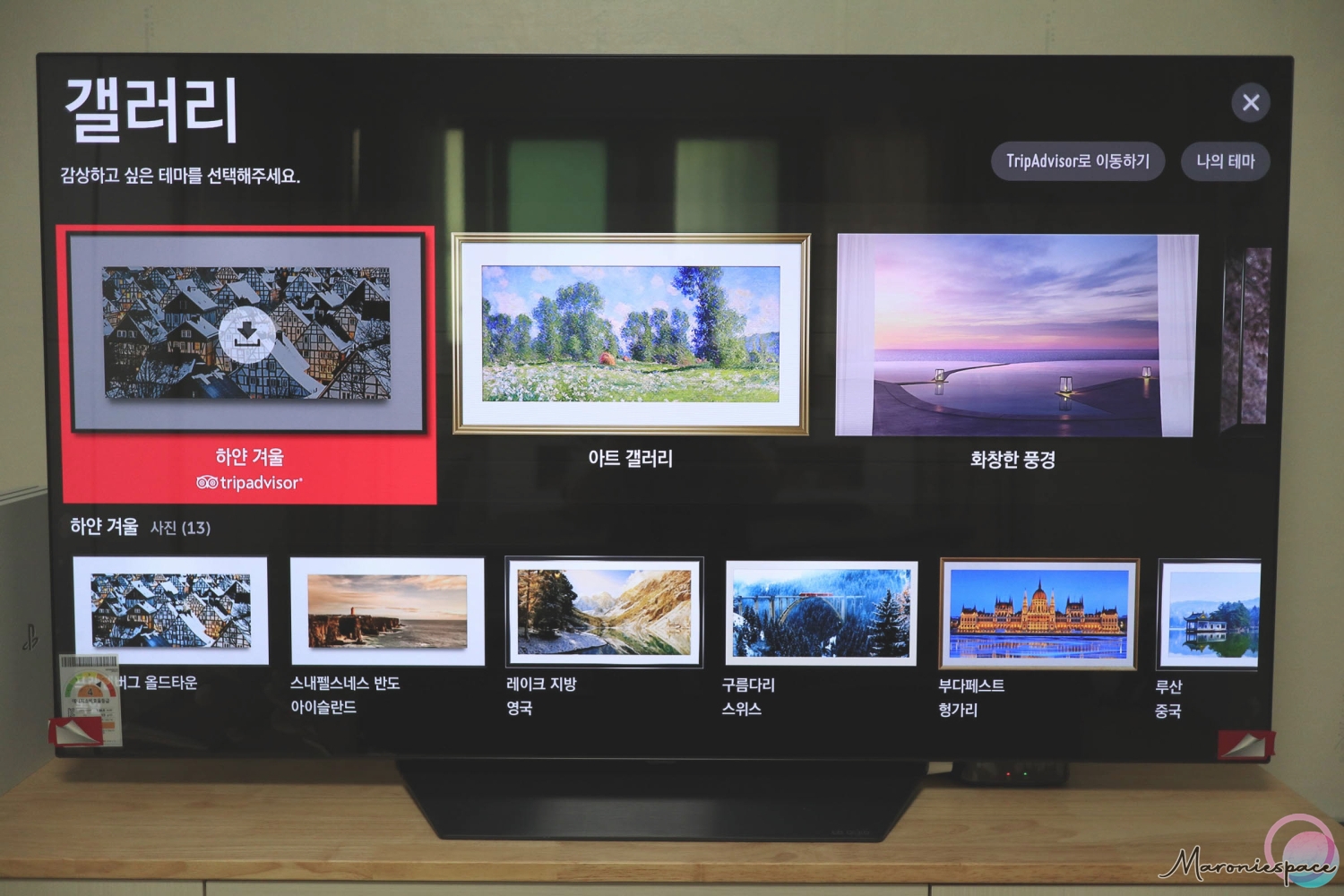 TV를 시청하지 않을 때에는 LG 올레드 55인치 TV로 갤러리 분위기를 연출할 수 있습니다. 리모컨의 집 모양을 눌러서 올레드 갤러리에 들어가면 각종 갤러리 이미지들을 선택할 수 있는데요. 단순하게 슬라이드 되는 사진들만 출력되는 것이 아니라 사진에 어울리는 잔잔한 음악이나 효과음까지 흘러나오기 때문에 조용한 분위기를 연출하고 싶을 때 사용하기 아주 좋은 기능이랍니다.