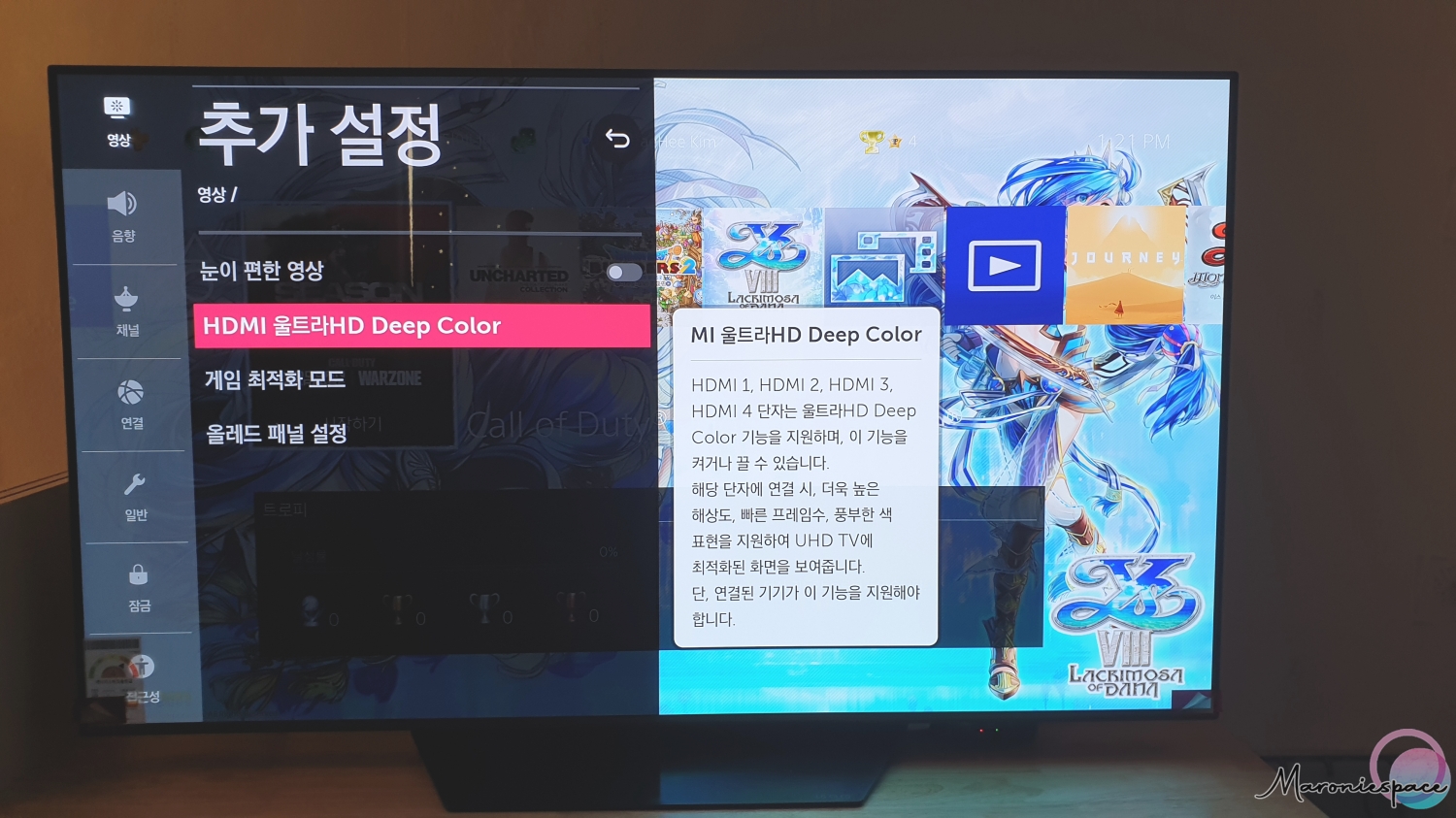 LG 올레드 55인치 TV(OLED55B9CNA)에 HDMI 케이블로 연결하면 더욱더 높은 해상도와 빠른 프레임(60프레임), 풍부한 색 표현을 지원하여 UHD TV에 최적화된 화면을 보여주는 기능인데요. HDMI로 연결되는 셋탑박스, 즉 케이블 TV라던지 PS4 Pro 같은 HDMI로 연결되는 외부 입력 장치의 경우에는 이 기능을 100% 활용할 수 있답니다.