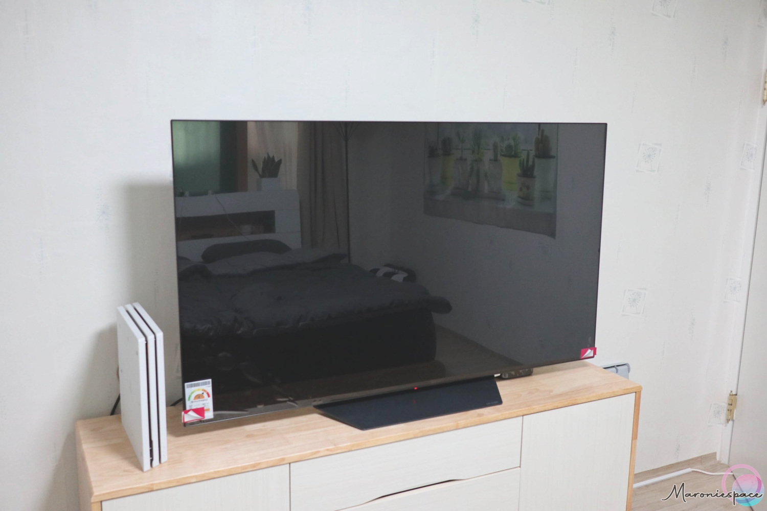 매장에서 봤을 때에는 55인치 제품보다 더 큰 제품들과 함께 전시가 되어있기 때문에 55인치도 그렇게 커보이지 않았습니다. 그래서 55인치 이상의 제품을 구매하려고 했었는데요. 막상 집에 설치하고 나니 55인치도 일반 가정집에서는 엄청 크게 느껴지더라구요. 집에 놀러 온 사람들마다 다들 TV가 크다고 말할 정도면 확실히 크기가 크긴 큰가 봅니다.