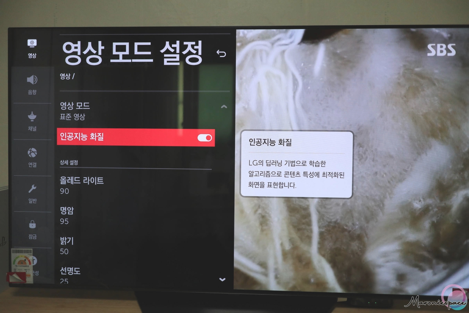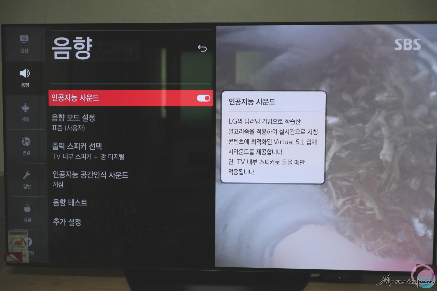 인공지능 사운드를 ON으로 설정한 경우에는 뉴스, 영화, 음악 등등 다양한 콘텐츠에 알맞은 버추얼 5.1 입체 사운드를 구현해준다고 합니다. 개인적으로 인공지능 화질의 경우에는 눈으로 체감이 가능한 부분이었지만 인공지능 사운드만큼은 제가 체감할 수 있는 영역이 아니었습니다. 그래도 그냥 꺼두기에는 아쉬워서 일단은 켜 둔 상황입니다.