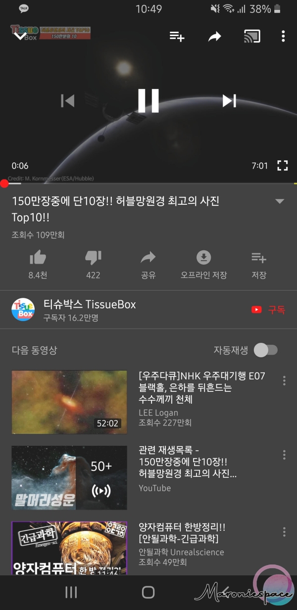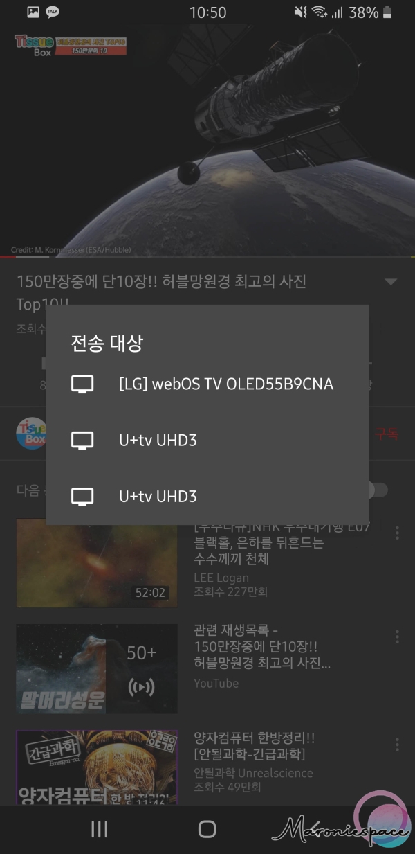 제가 제일 편리하게 애용하는 기능입니다. 스마트폰에서 유튜브 영상을 보다가 큰 화면으로 보고 싶을 땐 전송 기능을 통해 TV로 화면을 출력할 수 있어요! 같은 와이파이에 연결되어있으면 사용 가능한 기능입니다.(근데 뭐 LG 올레드 55인치 TV가 아니라도 가능한 기능이지만요..)