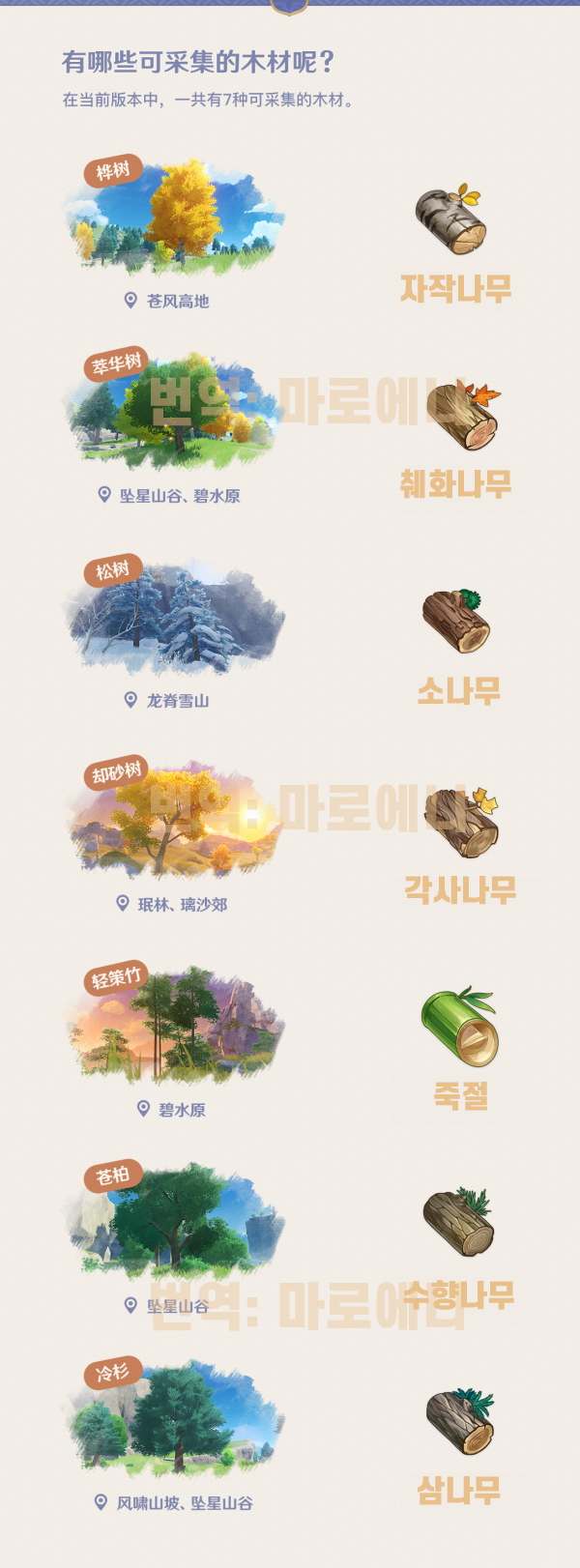 그래서 바로 밖으로 나가, 눈 앞에 보이는 나무들을 바로 썰어봤더니 나무들이 나오긴 하는데.. 수향나무...? 나무도 여러 종류가 있나 보더라구요. 알고 보니 나무는 총 7종(자작나무, 췌화나무, 소나무, 각사나무, 죽절, 수향나무, 삼나무)가 있다고 하네요? 그래서 바로 중국 공략 사이트를 참고해보았습니다.