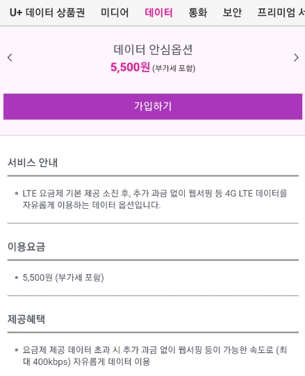 원래는 33 요금제를 유지하면서 5,500원에 서비스되고 있는 추가 요금 걱정 없는 데이터 안심옵션을 가입하려고 했어요. 이 서비스는 데이터를 다 소비해도 그 이후 사용되는 모든 데이터를 400kbps의 속도로 사용할 수 있다고 하는데요. 생각보다 가성비가 좋은 서비스 같아서 가입하려고 했으나 이 포스트의 글을 보고 생각을 접었습니다. 유튜브도 원활하게 볼 수 없고 블로그를 볼 때 가끔 로딩이 되지 않는다고 하니 대충 속도가 짐작되더라구요.