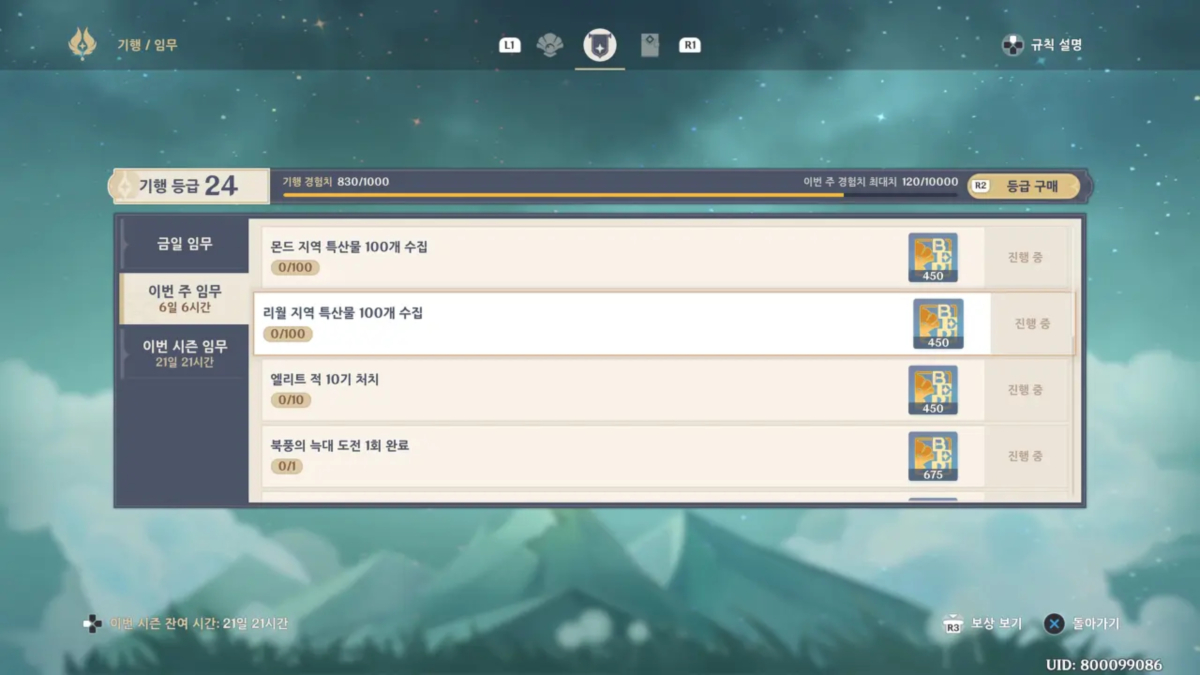 원신 시즌 패스라고 볼 수 있는 기행의 레벨업에 필요한 경험치를 빠르게 획득하기 위해서는 주간 미션을 클리어하는 것이 많은 도움이 됩니다. 오늘은 그 미션 중에서 몬드 지역 특산물 100개