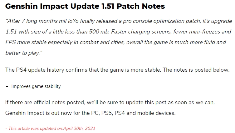 “7개월이 지난 후 miHoYo는 마침내 프로 콘솔 최적화 패치를 출시했으며, 이번 패치는 크기가 500MB 미만인 1.51 업데이트입니다. 특히 전투와 도시에서 더 빠른 전환 화면, 더 적은 미니 멈춤 및 FPS가 더 안정적이며 전반적으로 게임이 훨씬 더 유연하고 플레이하기 더 좋습니다. " PS4 업데이트 기록은 게임이 더 안정적임을 확인합니다. 메모는 아래에 게시되어 있습니다. 게임 안정성 향상 공식 노트가 게시된 경우 가능한 한 빨리 이 게시물을 업데이트하도록 하겠습니다. Genshin Impact는 이제 PC, PS5, PS4 및 모바일 장치 용으로 출시되었습니다.