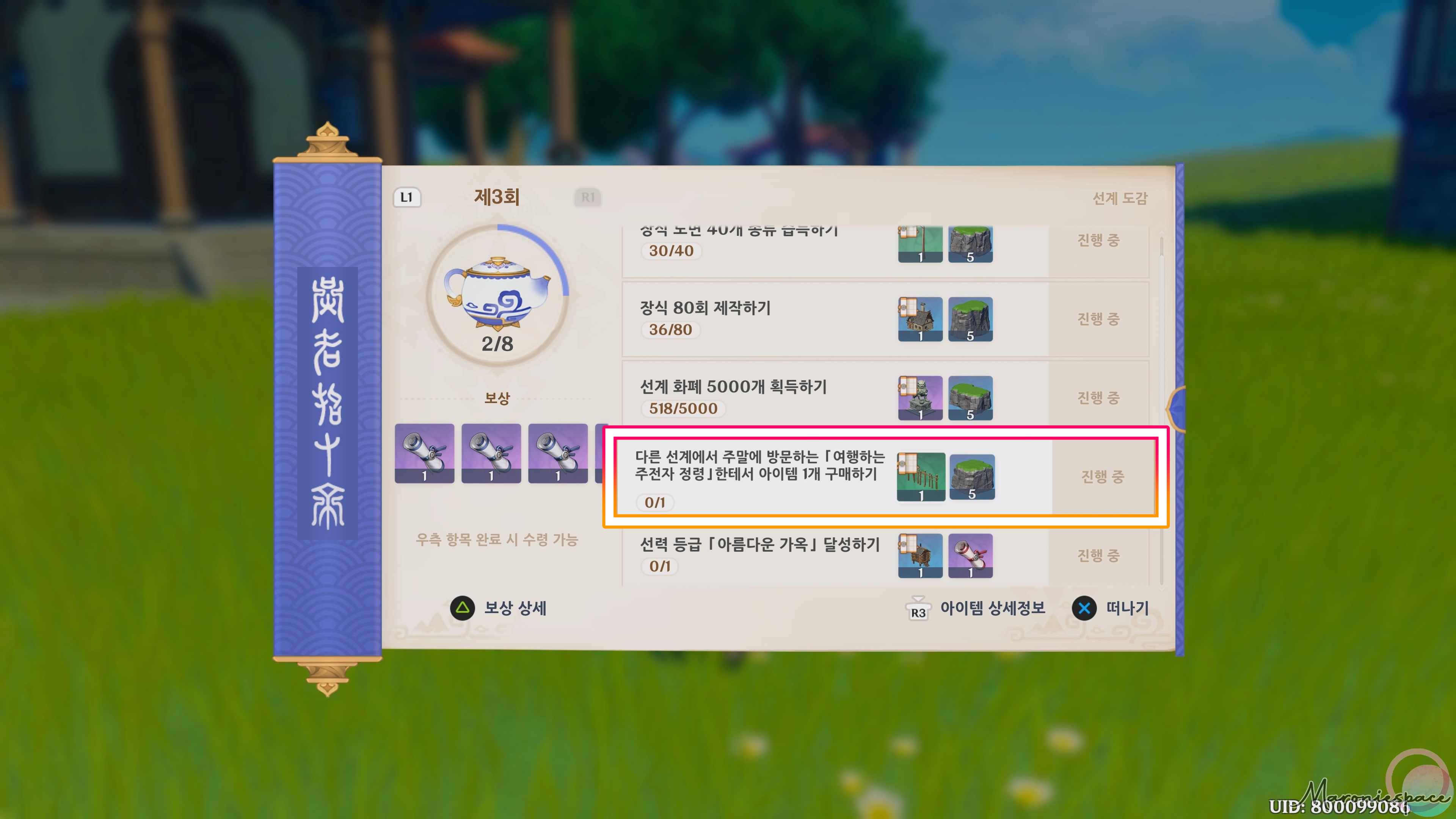속세의 주전자 임무를 진행하다 보면 제3회에서 다른 선계에서 주말에 방문하는 '여행하는 주전자 정령'한테서 아이템 1개 구매하기라는 임무가 있습니다.
