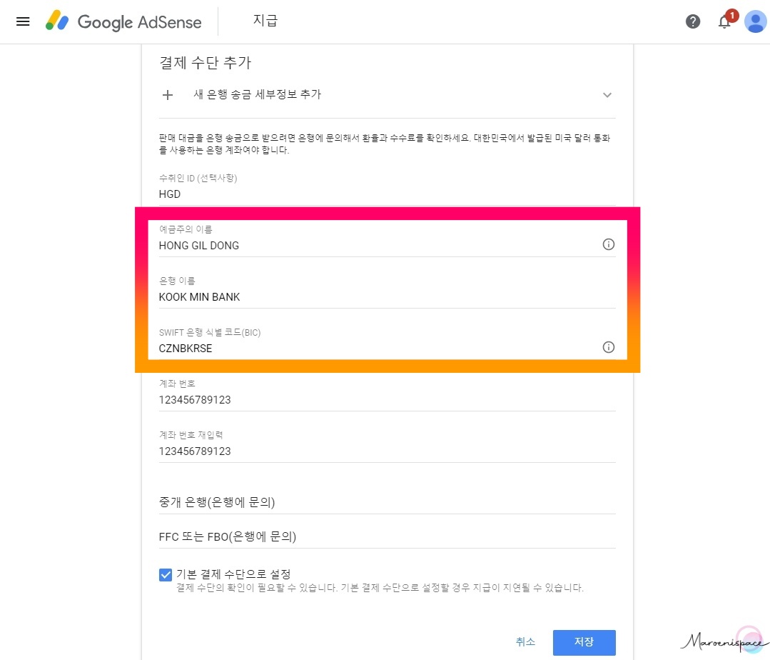 이렇게 애드센스 수익을 지급받을 수 있는 계좌가 등록됩니다. 상단에 나타나는 오류메시지는 계좌 등록 후 10~20분 정도 지나면 사라지니 신경쓰지 않으셔도 된답니다~