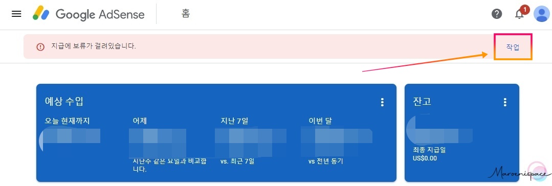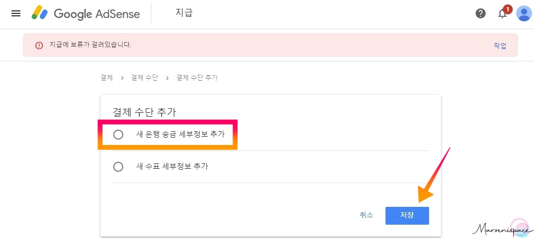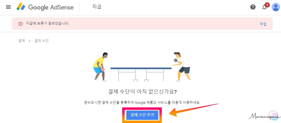오랜만에 애드센스 사이트에 들어가보니 상단에 지급에 보류가 걸려있습니다. 라는 오류 메시지가 나타나더라구요. 그동안 블로그 수익에 관심이 없던터라.. 이 메시지가 언제부터 나타났는지는 알 수 없었지만 해당 문제에 대해 구글링을 해보니 결제 수단을 등록하지 않아서 그렇다고 하네요. 그래서 언넝 결제 수단을 등록하기로 했어요.