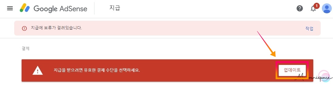상단의 지급 보류 오류 메시지 화면에서 작업을 눌러주시고 업데이트를 눌러주세요.