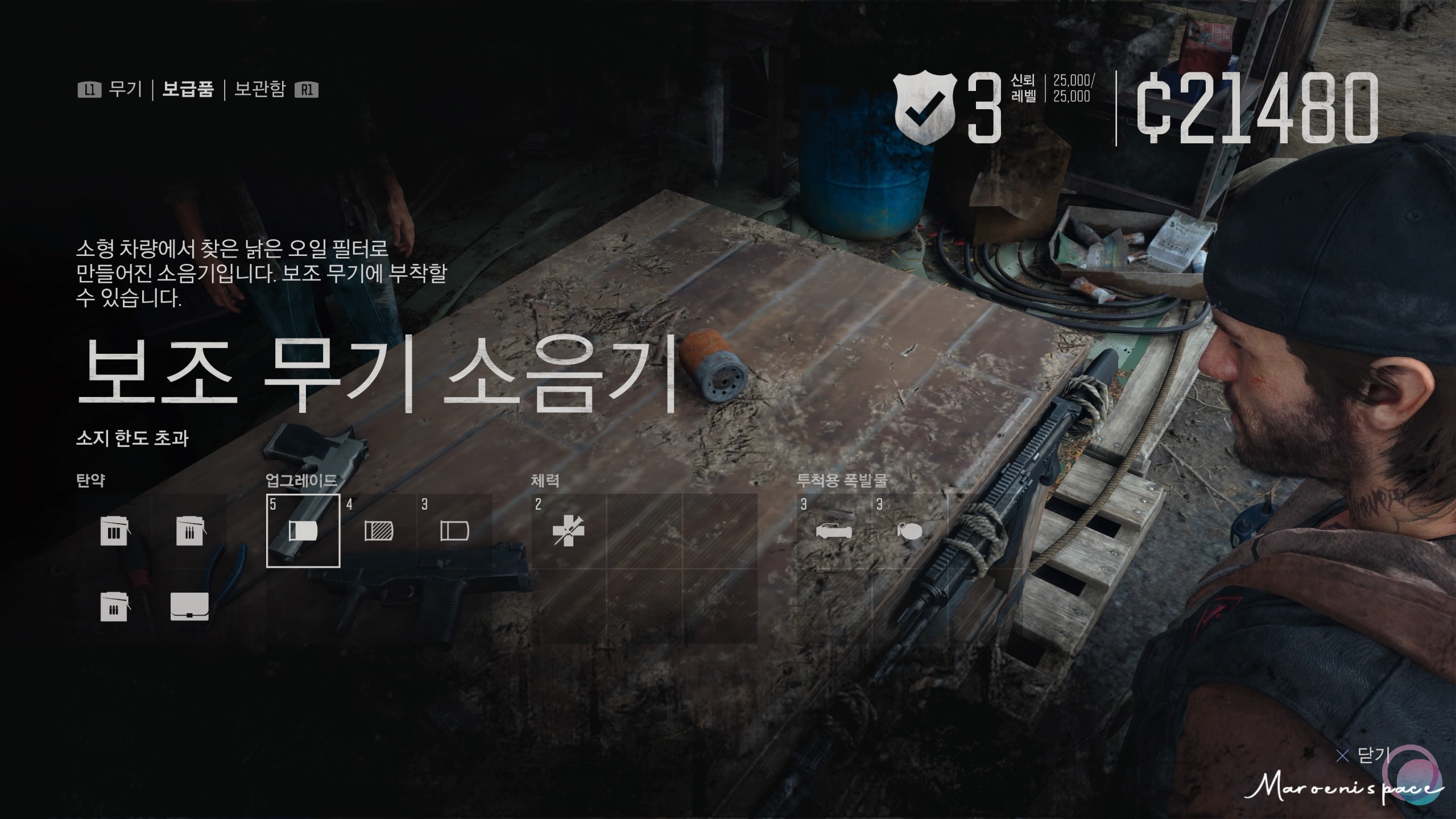 데이즈곤에서 소음기는 영구 아이템이 아닌 소비 아이템으로 취급됩니다. 아포칼립스 세계관에서 멀쩡한 소음기를 구한다는 것 자체가 말이 안 된다는 것을 알고 있긴 하지만 그래도 소음기를 소모품으로 취급한 것은 조금 너무하다고 생각이 들었습니다.