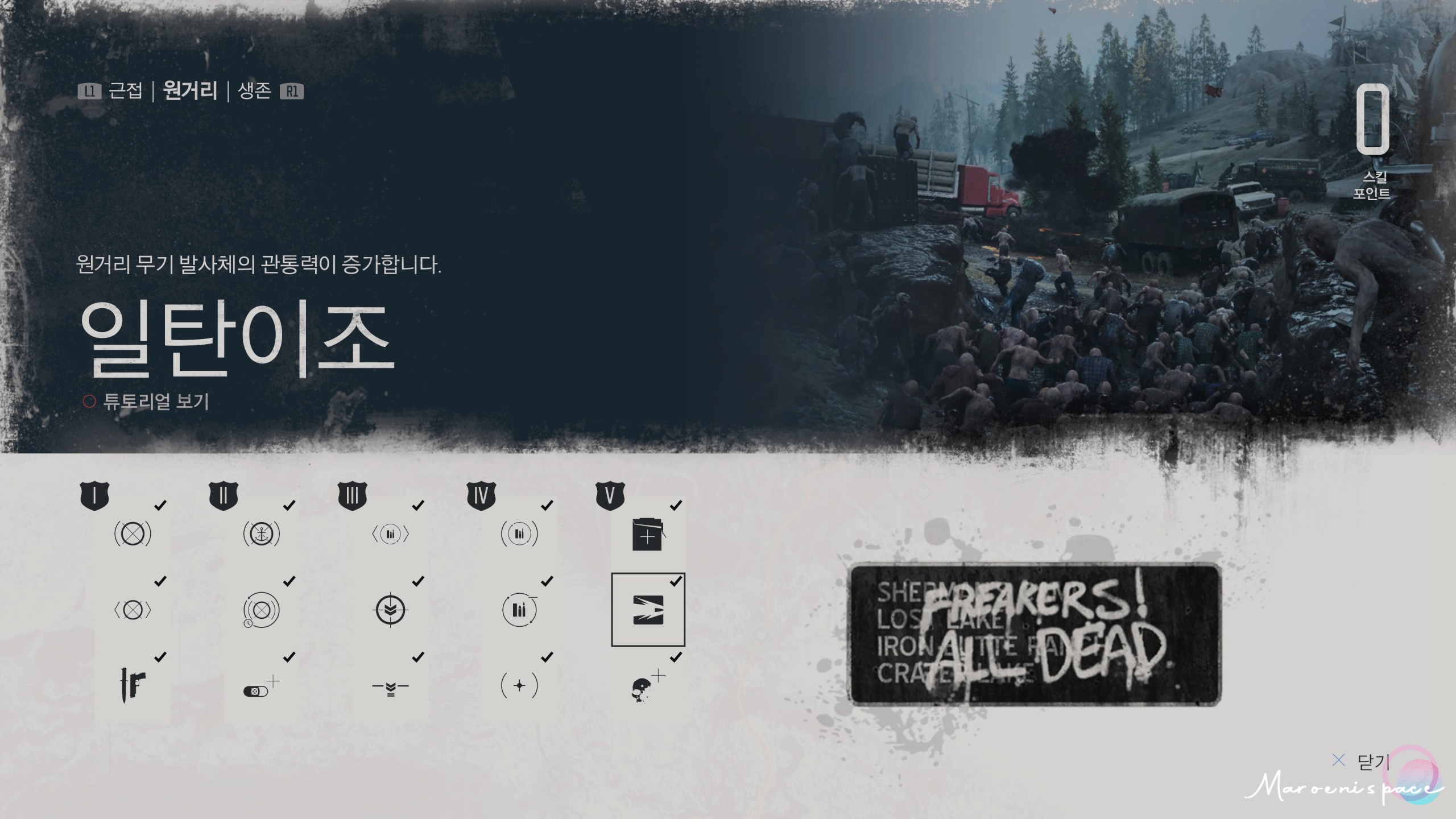 데이즈곤에는 스킬이라는 것이 존재하는데요. 이 스킬 때문에 뭐랄까.. 약간의 RPG? 요소가 가미된 듯한 느낌이 들더라구요. 초반에는 별생각 없이 스킬을 찍었지만 호드 사냥을 준비하게 되니 스킬의 중요성을 알 수 있었습니다.