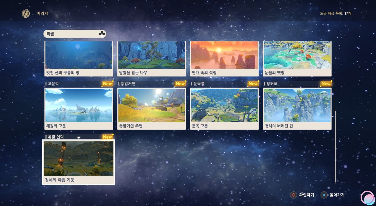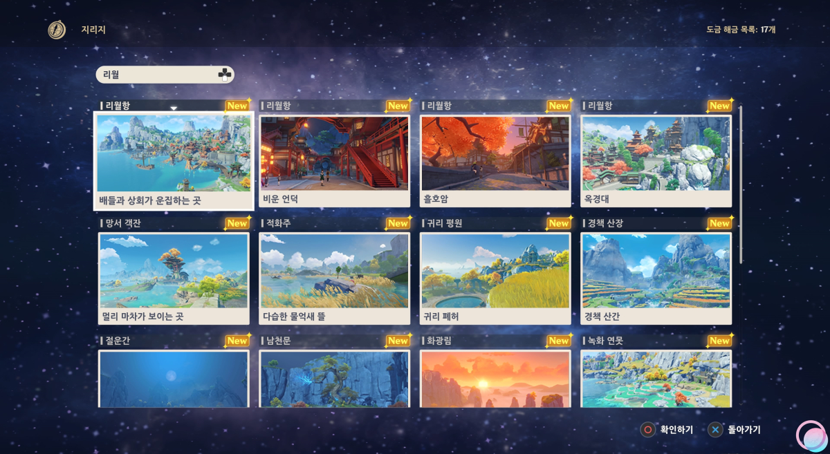 사진 속의 위치를 모두 다 돌게 되면 17곳의 리월 전망 포인트를 해금할 수 있습니다.