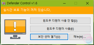 참고로 실시간 감지 기능이 종료된 상태에서는 Defender Control에서 노란색으로 표시됩니다. 이 상태에서는 다른 바이러스에 감염될 가능성이 있기 때문에 반드시 다른 백신 프로그램을 사용하시는 것을 권장합니다.