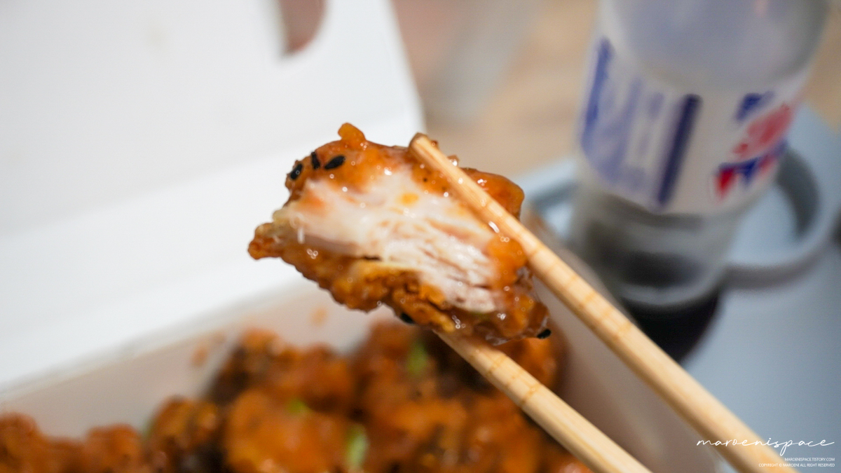 한입 베어먹어니 확실히 닭다리살 느낌이더라구요. 근데 뭔가 느낌이 껍데기가 없는 닭다리살의 느낌이었고 소스가 발라져있음에도 튀김옷이 바삭바삭해서 식감이 정말 좋더라구요.