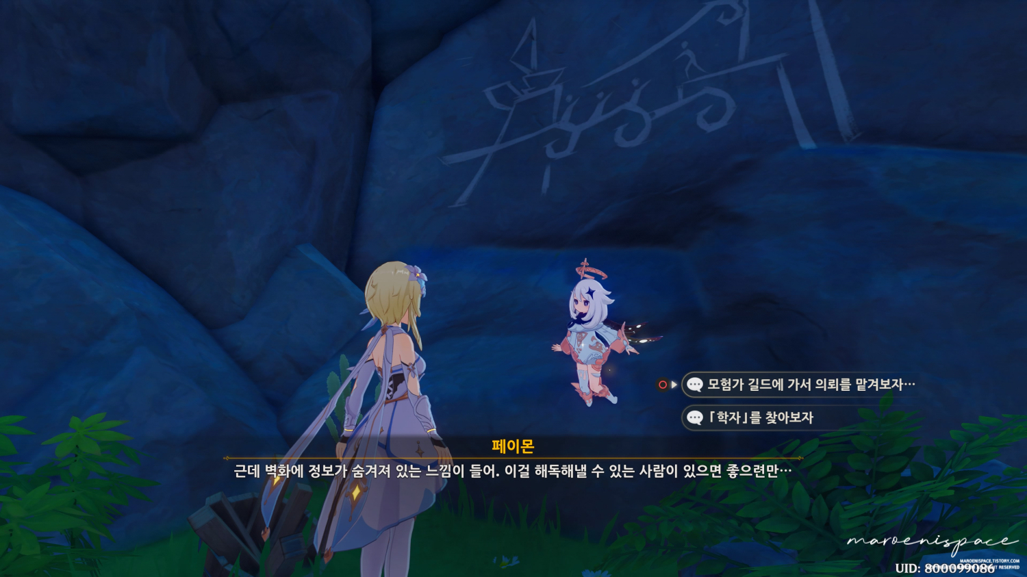 마지막으로 쌍둥이섬 옆에 이름 없는 섬으로 가면 벽화를 발견할 수 있는데 5개의 벽화를 다 발견한 후 몬드성 학자에게 가져다주면 됩니다.