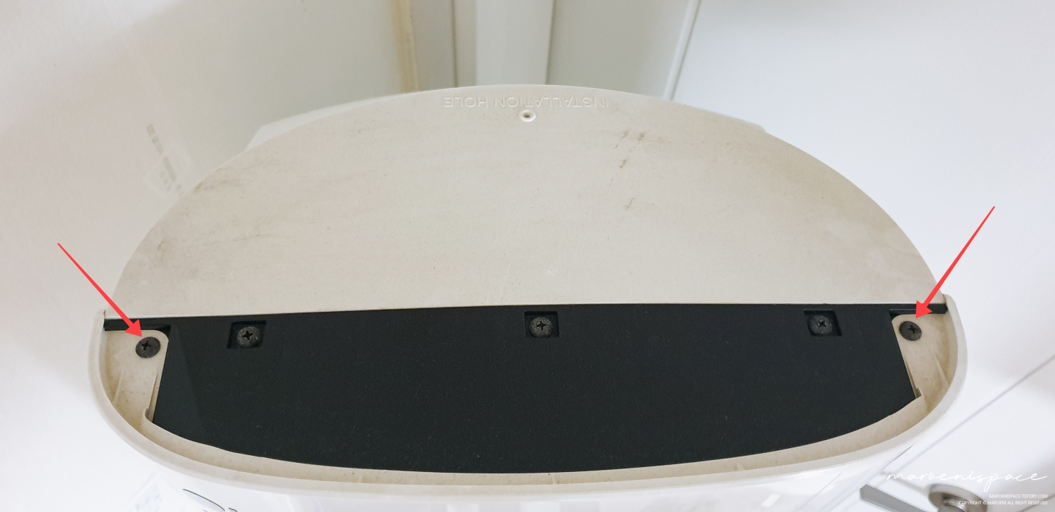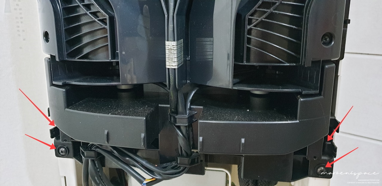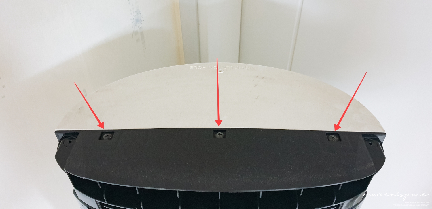 이제 에어컨 상판을 분해해야 하는데, 사실 이것도 나사 5개만 분해하면 되기 때문에 그렇게 어려운 것은 없어요. 사진에 표시된 부분의 나사 2개를 풀어주고