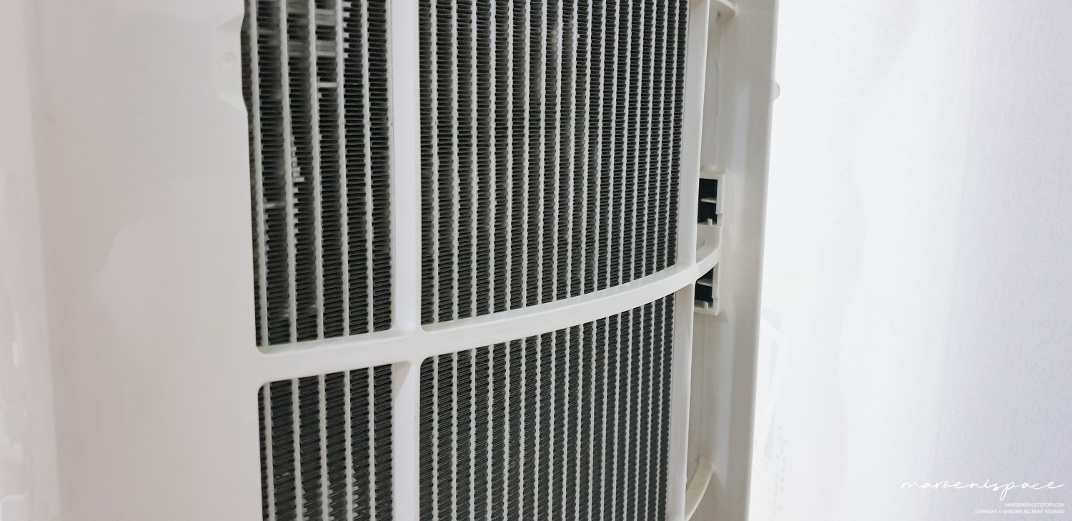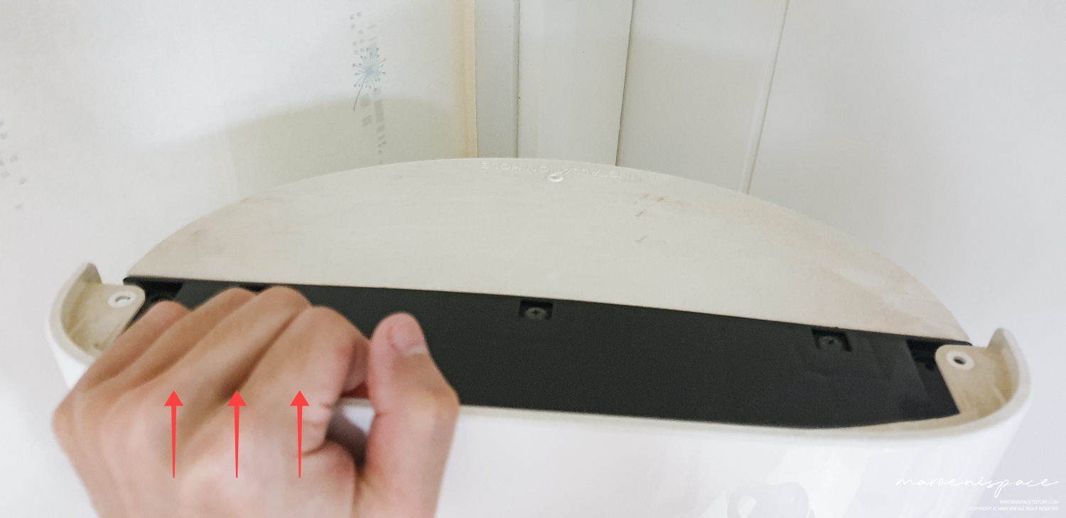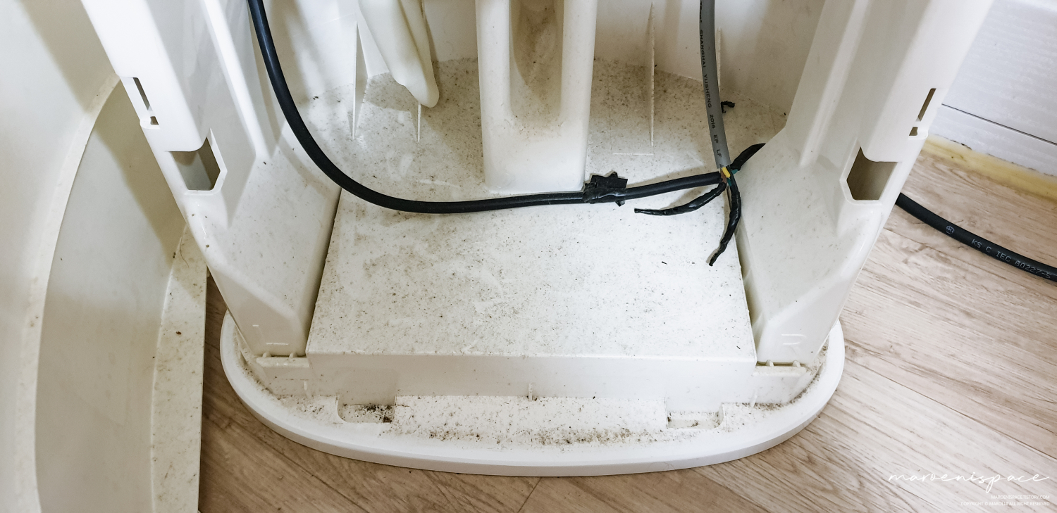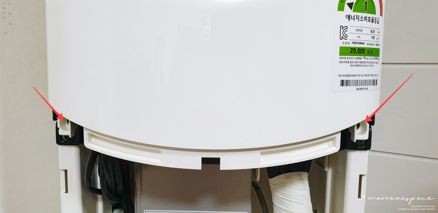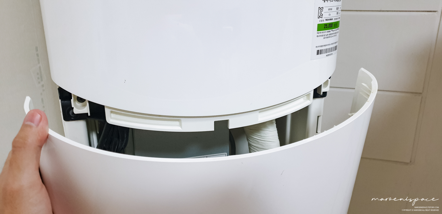 에어컨 하단부를 보면 이렇게 갈라진 공간이 있는데 이 사이에 손가락을 집어넣고 하판을 뜯어내 주세요. 처음에는 저도 박살 나면 어떻게 하지? 하면서 조심조심 만졌는데, 이 녀석이 조심스럽게 만져주니까 잘 빠지지가 않더라구요. 그래서 살짝 힘을 줘서 땡기니 두두둑 하면서 뭐가 박살 나는 소리와 함께 분리되더라구요? 혹시나 박살 난 건 아닐까? 하고 요리조리 살펴보니 그냥 소리만 우왁스러웠다는..