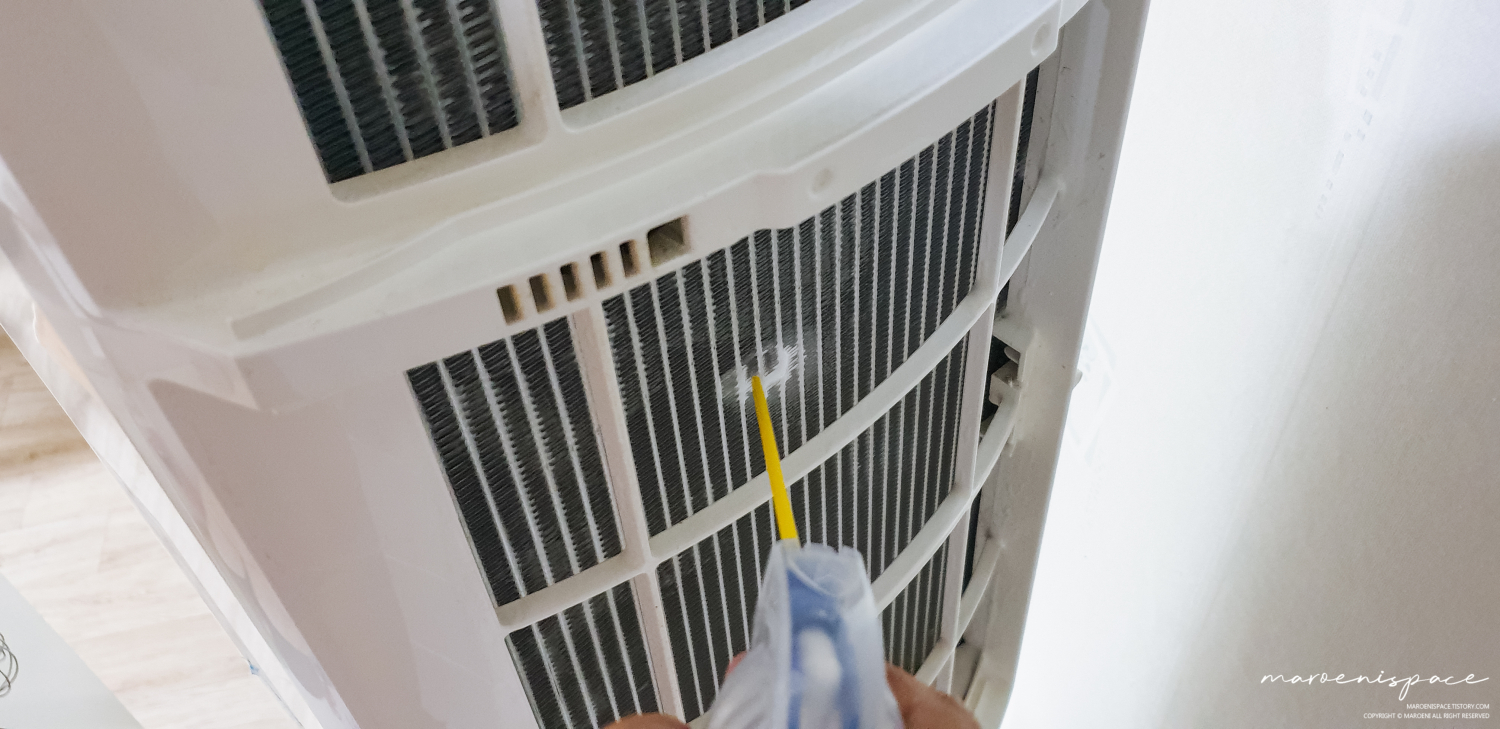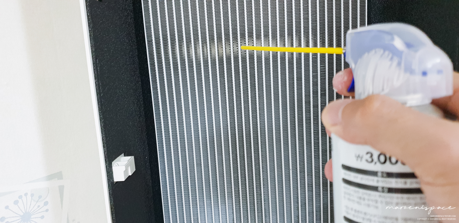 이제 다이소에서 구해했던 에어컨 세정제를 냉각핀에 분사하면 됩니다. 생각보다 세정제의 양이 많았기 때문에 저는 조금 낭낭하게 뿌려주었어요.
