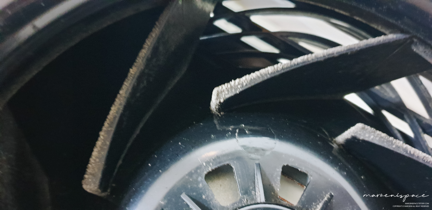 아앗...! 그런데 날개에 메챠쿠챠하게 피어있는 곰팡이를 발견했어요.. 보자마자 너무 경악을 해서 그런지 초점이 흐려진듯.. 여기도 남은 에어컨 세정제와 티슈를 이용해서 깨끗하게 닦아주었습니다.