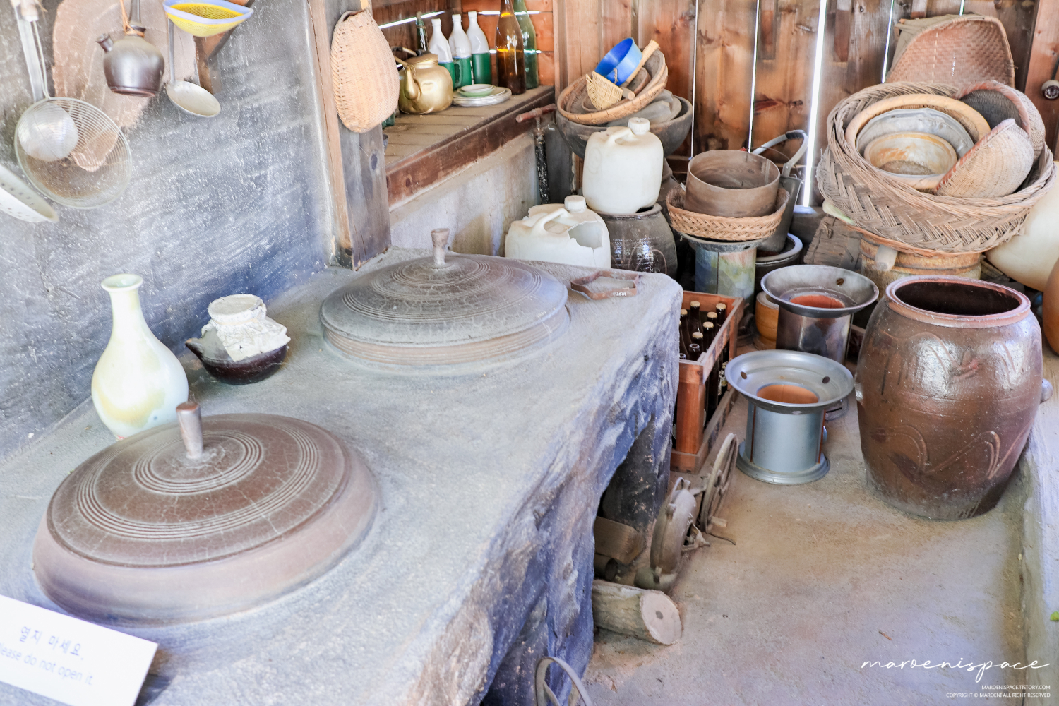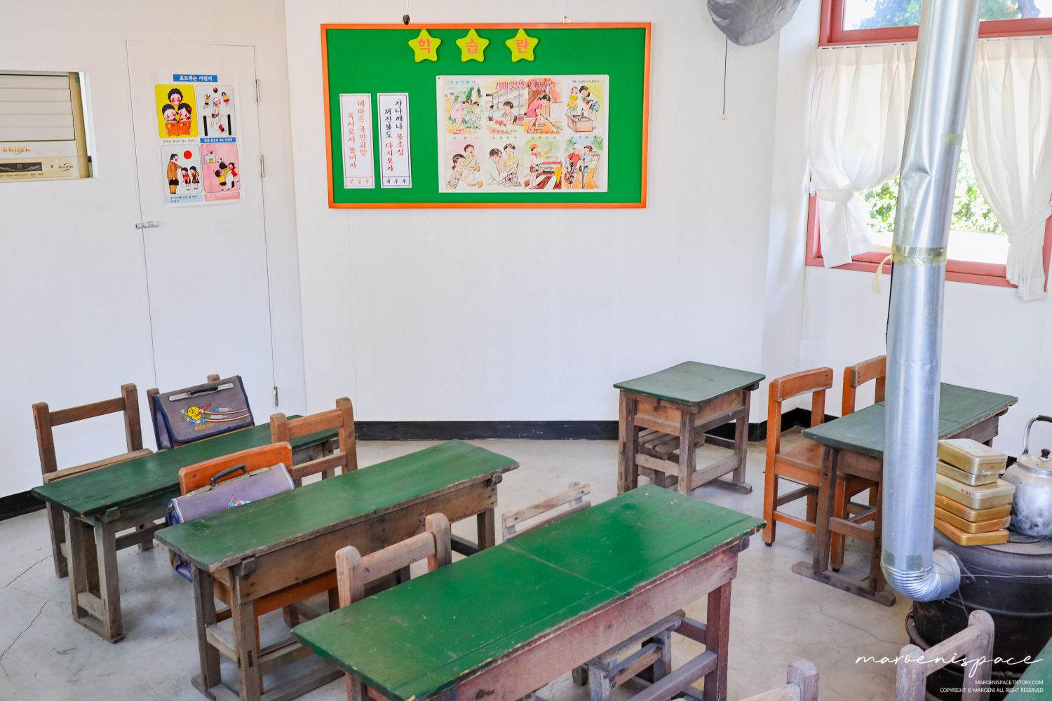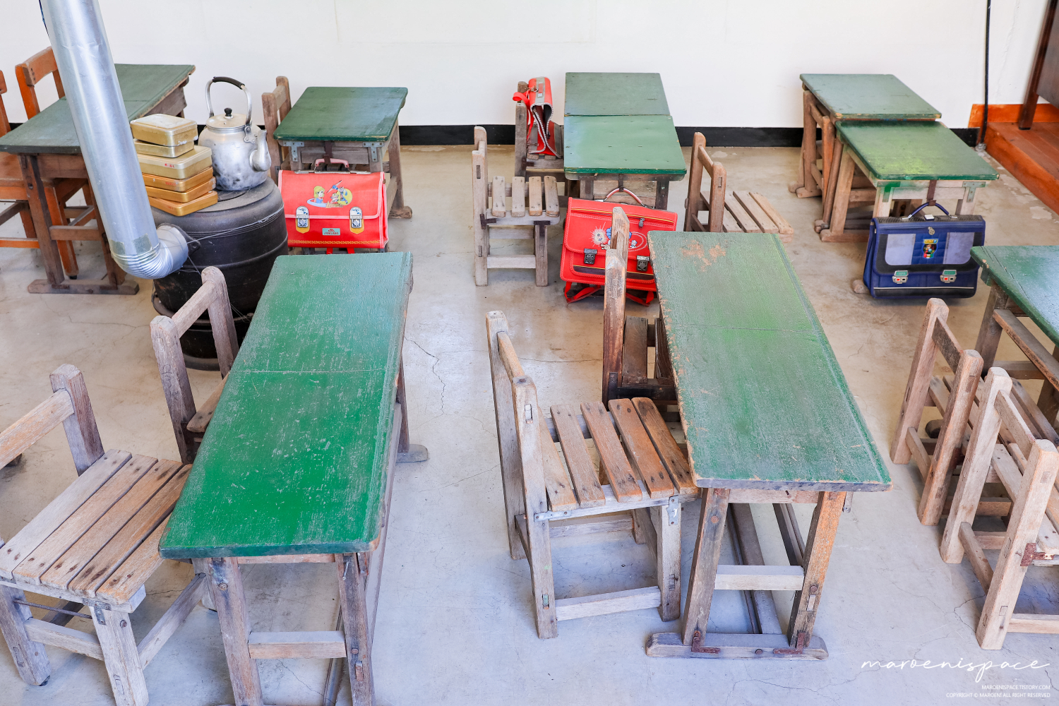 나무로 되어있는 책상과 의자, 네모 반듯한 책가방, 난로위의 주전자와 도시락.. 그시절 감성 그대로를 느낄 수 있는 교실이 재현되어 있습니다. 앉아서 칠판을 바라보면 어떤 느낌일지 궁금해져서 의자에 앉아보려고 시도해봤지만 다리도 들어가지 않는 것을 보니, 이제 저도 정말 나이가 들었구나 싶더라구요.