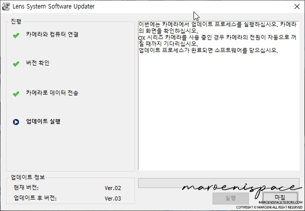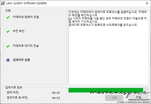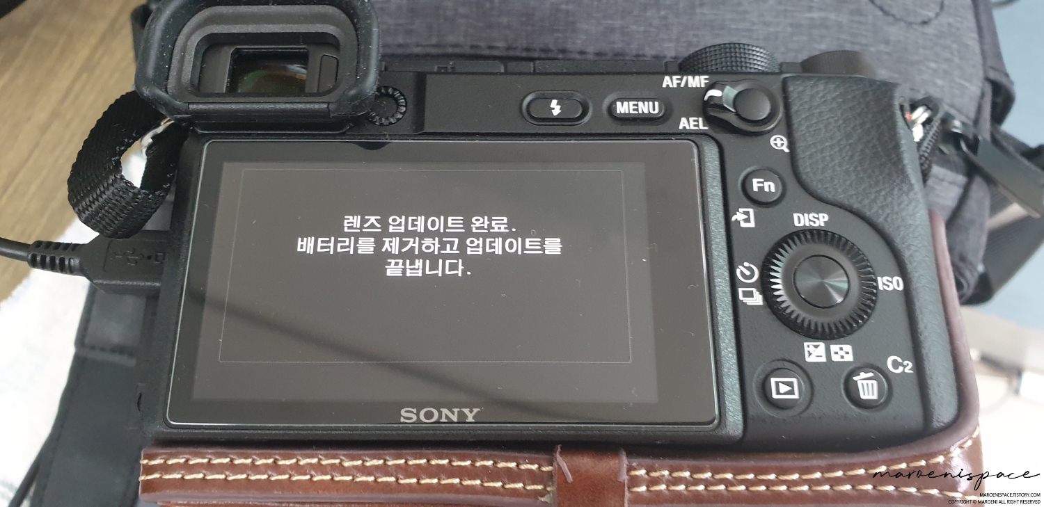 설치가 끝나면 카메라 화면을 확인해보라고 하네요. 화면을 보니 렌즈 업데이트가 끝났으니 배터리를 제거하고 업데이트를 끝내라고 하는데요. 배터리를 제거하지 않아도 그냥 전원만 껐다가 켜주셔도 OK!