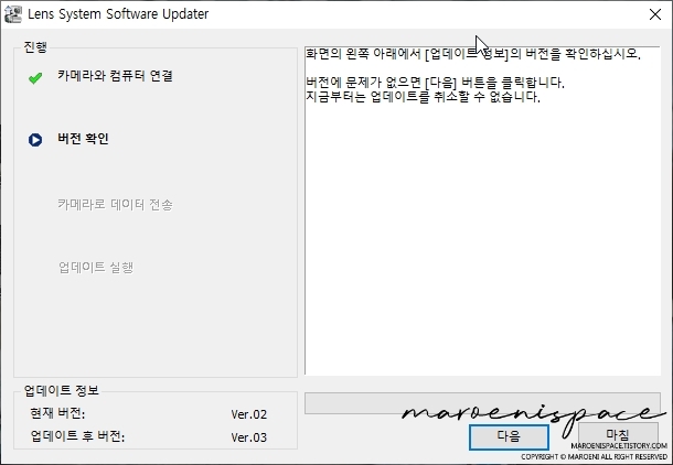 연결이 확인되면 다음을 눌러서 펌웨어 업데이트를 진행해줍니다. 엄청 오래 걸릴 줄 알았는데 생각보다 금방 끝나네요.