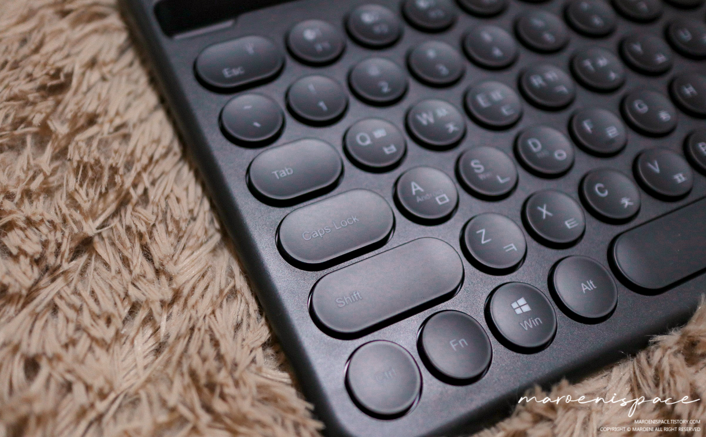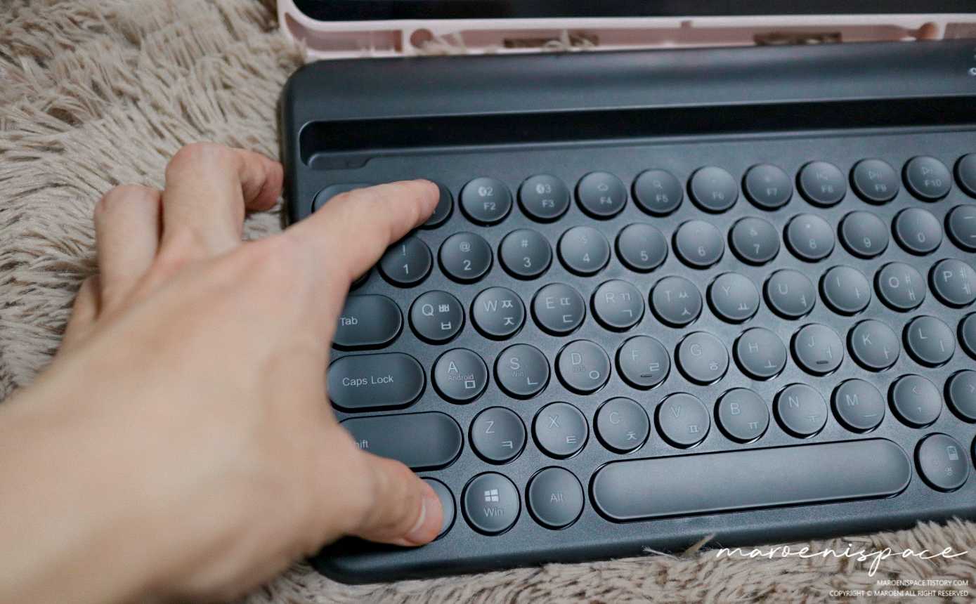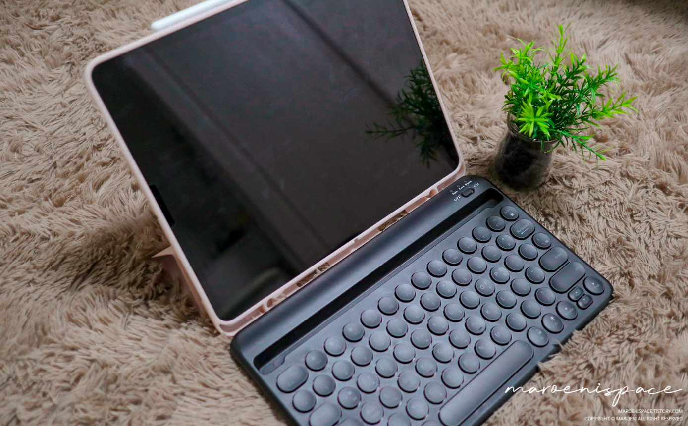 여러 저렴이 블루투스 키보드들 중에서 이 제품을 구매하게 된 가장 큰 이유는 아이패드 프로 4세대를 거치할 수 있는 거치대가 있다는 것과 귀찮게 배터리를 넣어서 사용할 필요가 없는 충전형이라는 것, 마지막으로 윈도우와 iOS 그리고 안드로이드에 연결해서 사용할 수 있는 범용성 때문이었습니다. 번외로 네모가 아닌 조약돌 같은 모양이 마음에 들었기 때문에...
