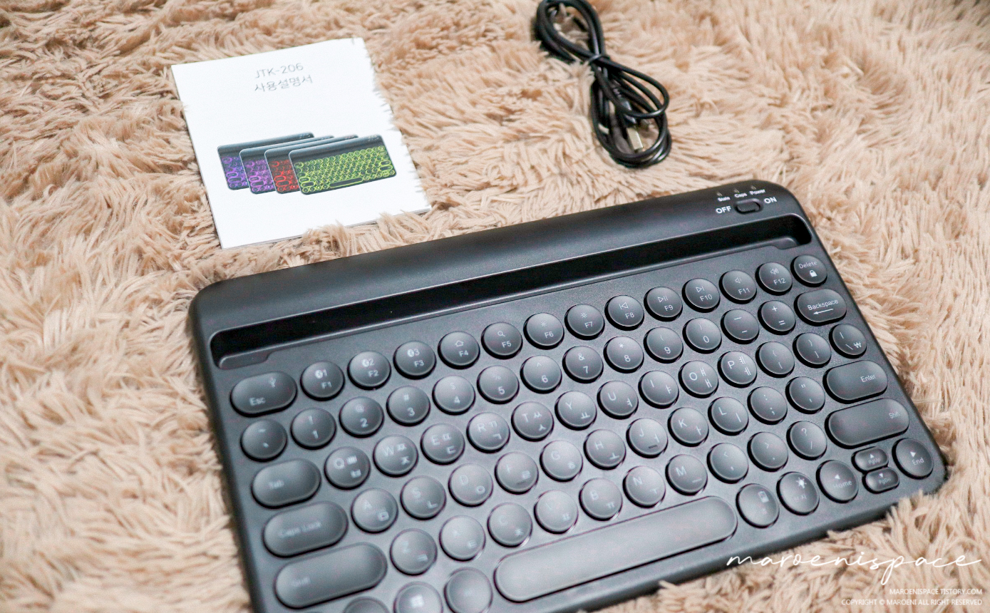 제품의 구성품과 JTK-206의 외관입니다~! 사용법이 적혀있는 설명서와 유선 & 충전 연결 용도로 사용 가능한 케이블, 그리고 키보드 본체가 들어있습니다.