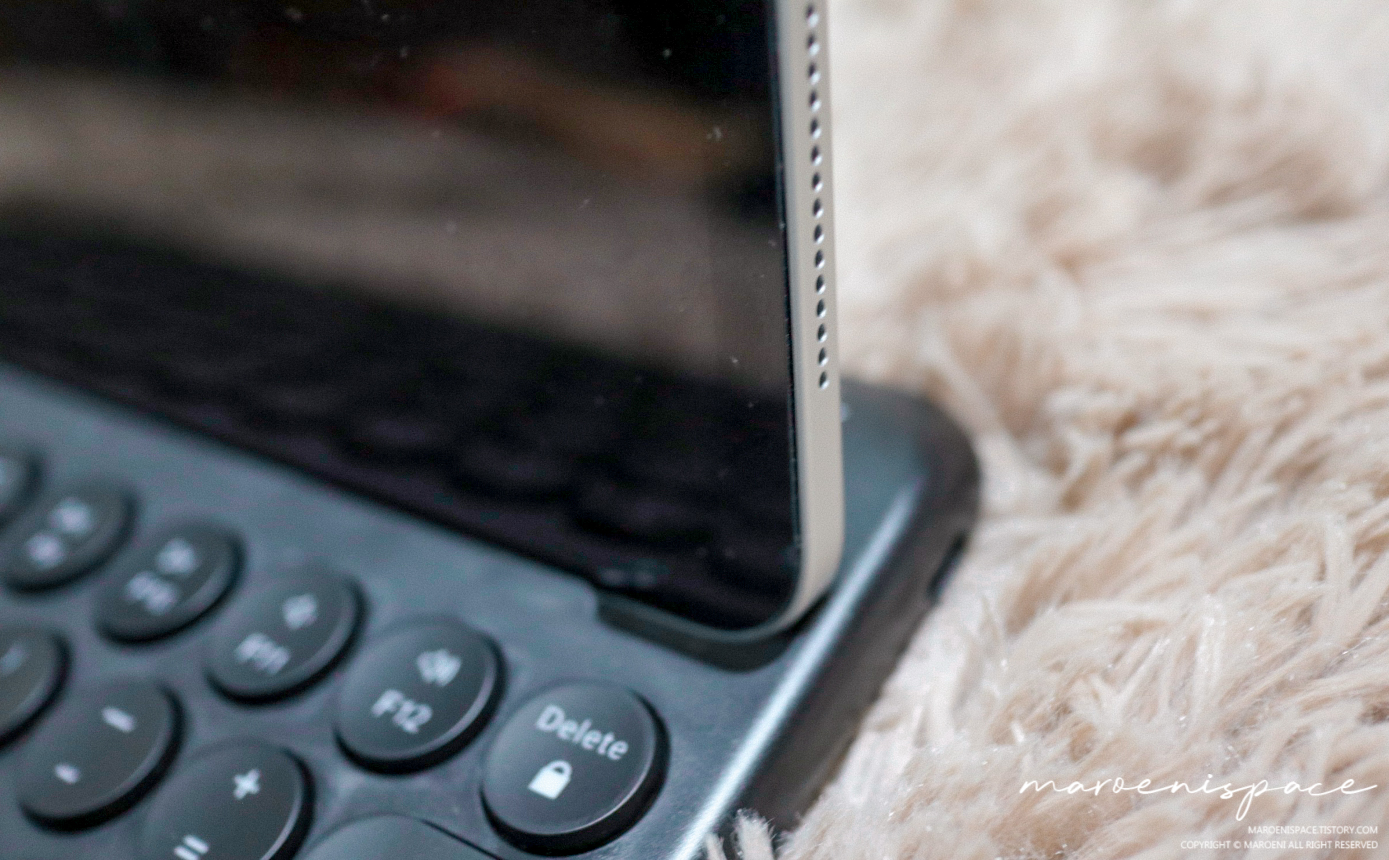 후아.. 그런데 문제가 발생했습니다. 아이패드 프로 4세대 12.9인치가 너무나도 큰 모양인지 거치대에 맞지 않네요.. 손가락 한마디 정도가 차이 났는데.. 다행히도 케이스 자체에 거치 기능이 있기에.. 키보드에 거치하는 것은 포기하는 걸로..