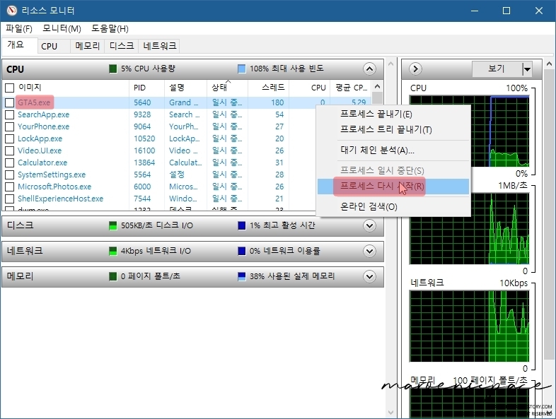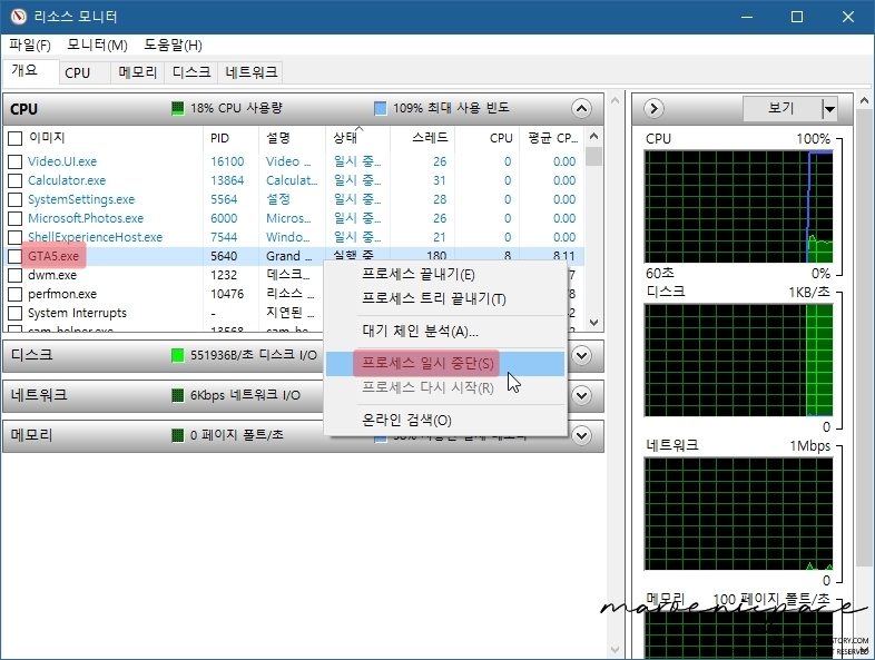 네트워크 항목에서 GTA5.exe를 찾은 후 프로세스 일시 중단 선택