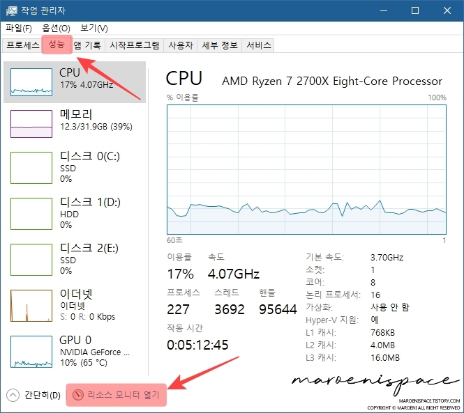 방법은 간단합니다. 작업관리자-성능-리소스 모니터 열기