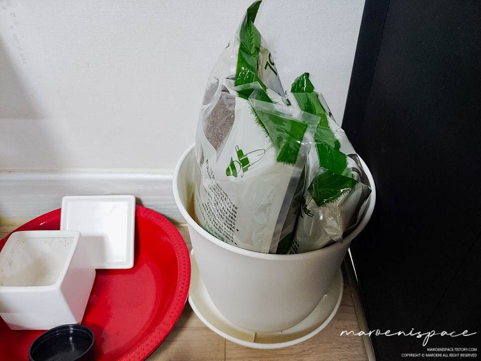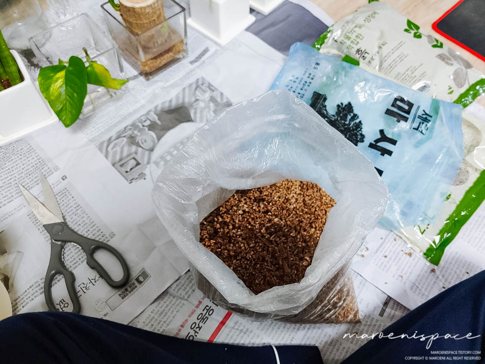 수경재배 후 남은 테이블 야자는 조금 큰 화분으로 옮겨줄 것이랍니다. 마사토와 흙을 봉지에 넣어 섞어주고